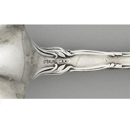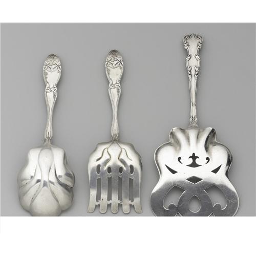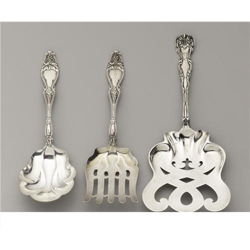 <B>Three American Silver Serving Pieces</B></I><BR><BR>Wilcox & Everston, New York, New York and Dominick & Haff, New York, New York<BR>Late Nineteenth / Early Twentieth Century<BR>Silver<BR>Marks: spoon and fork (Wilcox & Everston) <I>Sterling,</B></I> and (Dominick & Haff) <I>Sterling</B></I><BR>10.12 in. long (asparagus fork), 11.84 troy ounces total<BR>Comprising a pierced asparagus fork and large berry spoon each with a grapevine pattern, one monogrammed GLS; and with a large asparagus pierced fork in the Victoria pattern, monogrammed G