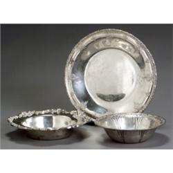 The first, a bowl, Alvin Corp., Providence, molded with stylized petals within an abstract geometric border; the second, a bowl, Frank M. Whiting Co., North Attleboro, MA, having a scalloped rim with applied molded leafage and scroll decoration; the third, a cake plate, Towle Silversmiths, Newburyport, MA, the border with impressed floral decoration. Each impressed with factory mark. Each with light scratching; the first two with light rubbing to high points of decoration.