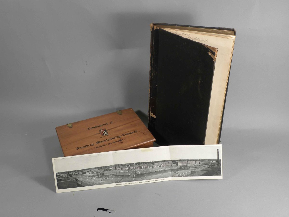 Lot of Three Amoskeag Firemen'srelated items including panoramic postcard, wood box and Amoskeag 1887-1898 Fire Department Log Book.
