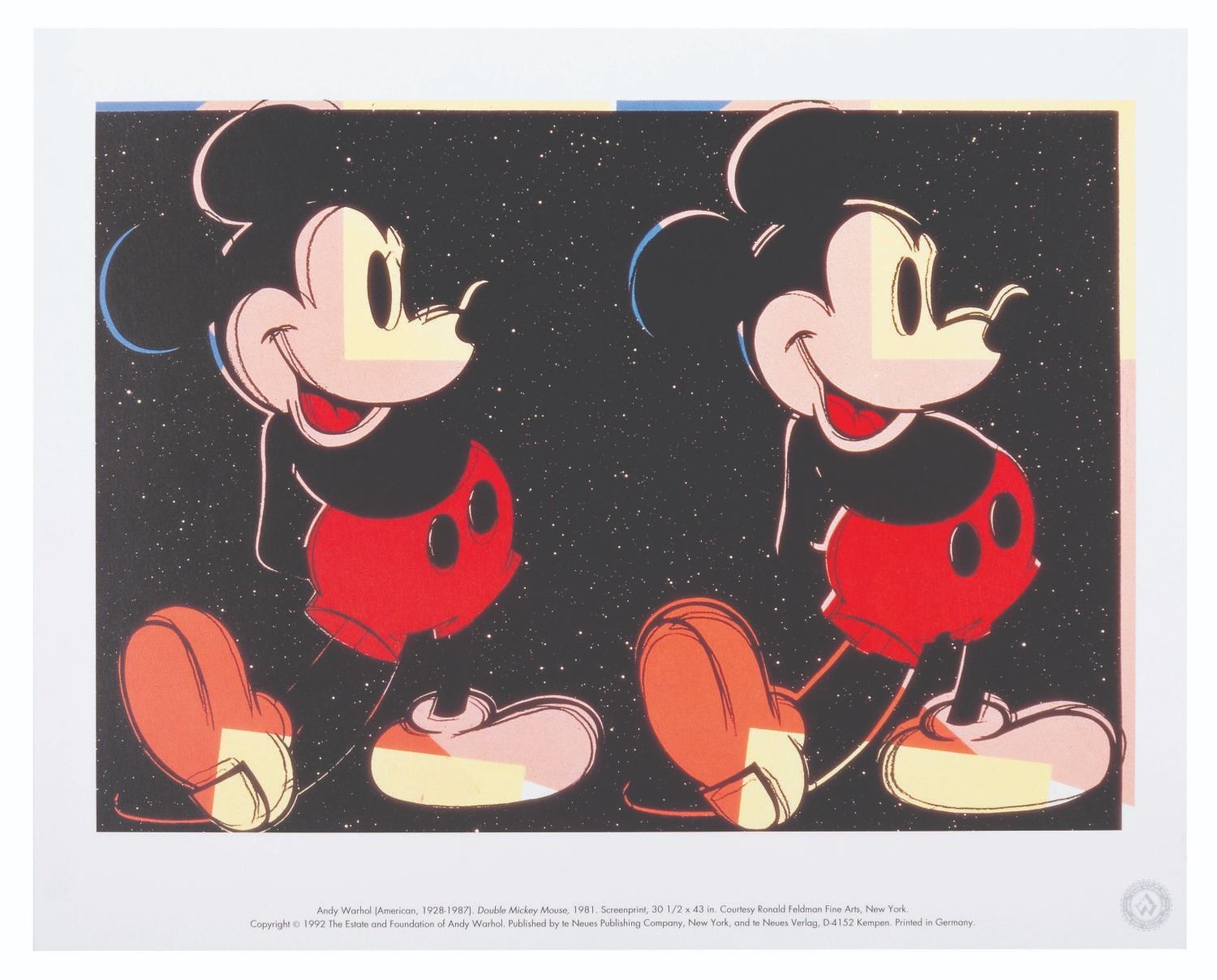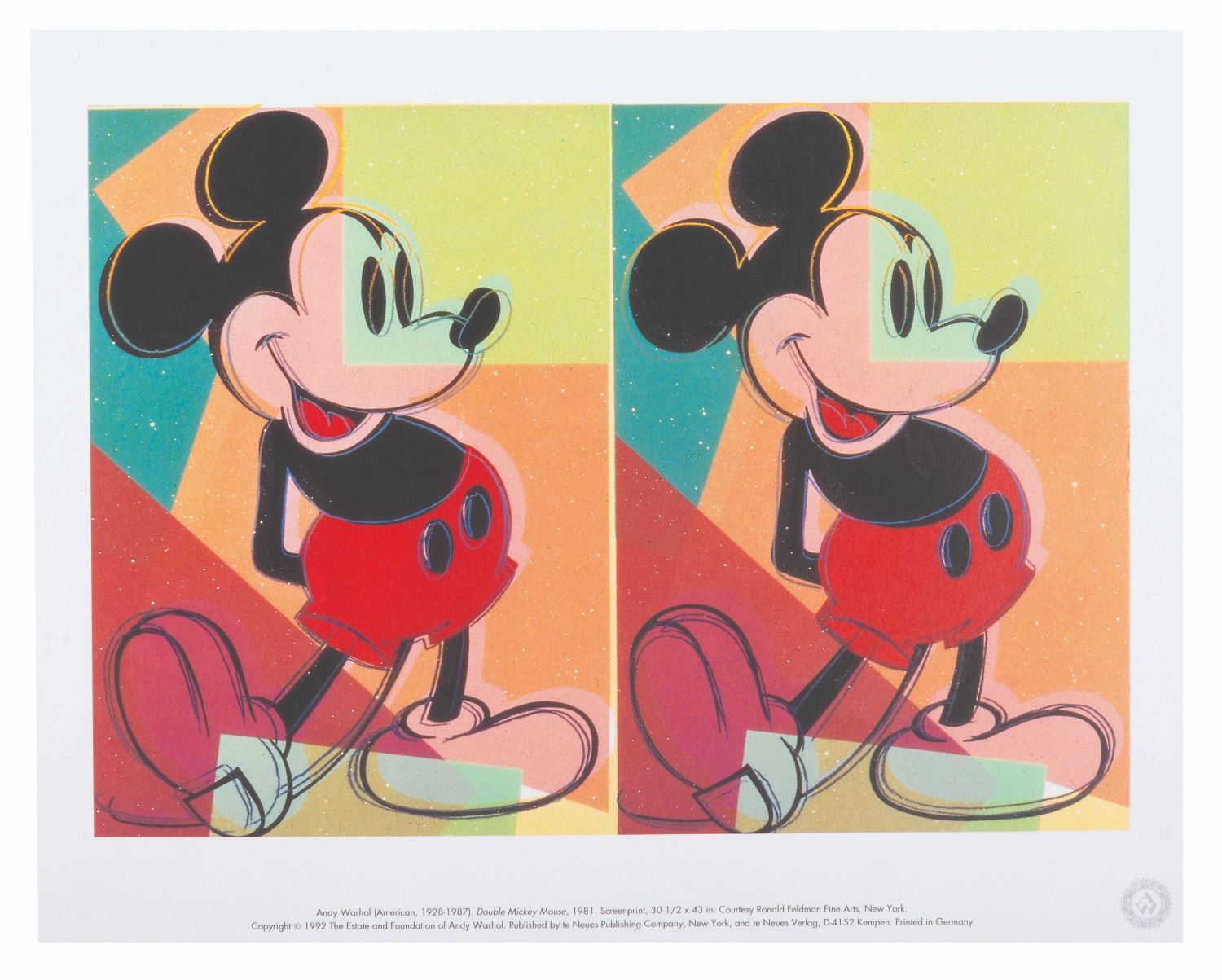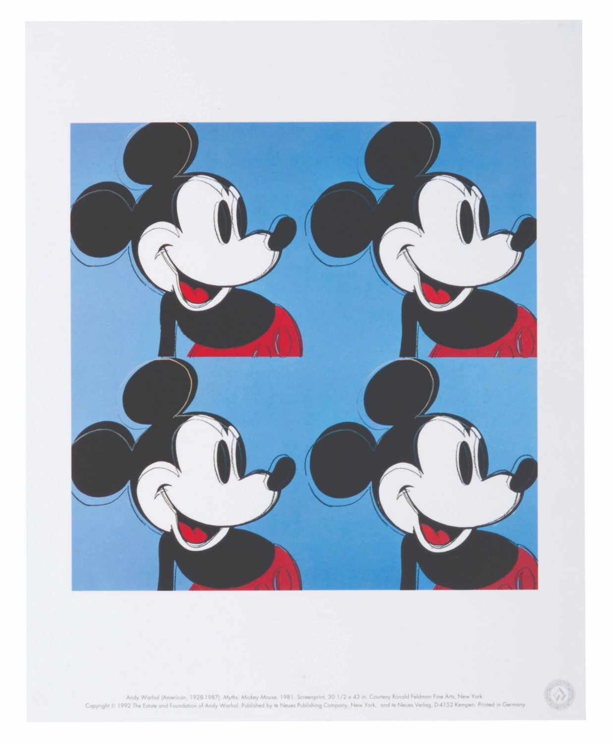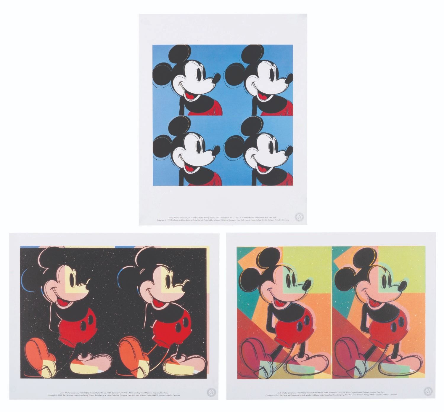 (Warhol, 1992) Three prints of Mickey Mouse screenprinted artwork by Andy Warhol. Included are prints of “Myths: Mickey Mouse,” and two of “Double Mickey Mouse,” from the Andy Warhol Foundation for the Visual Arts. Measuring 9.5” x 11” and are in very good to fine condition with one exhibiting a very light stain at the bottom center which does not affect the image and two small pieces of tape on the reverse.