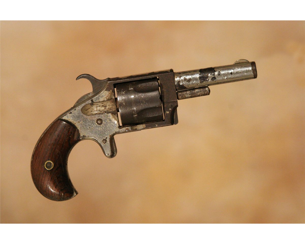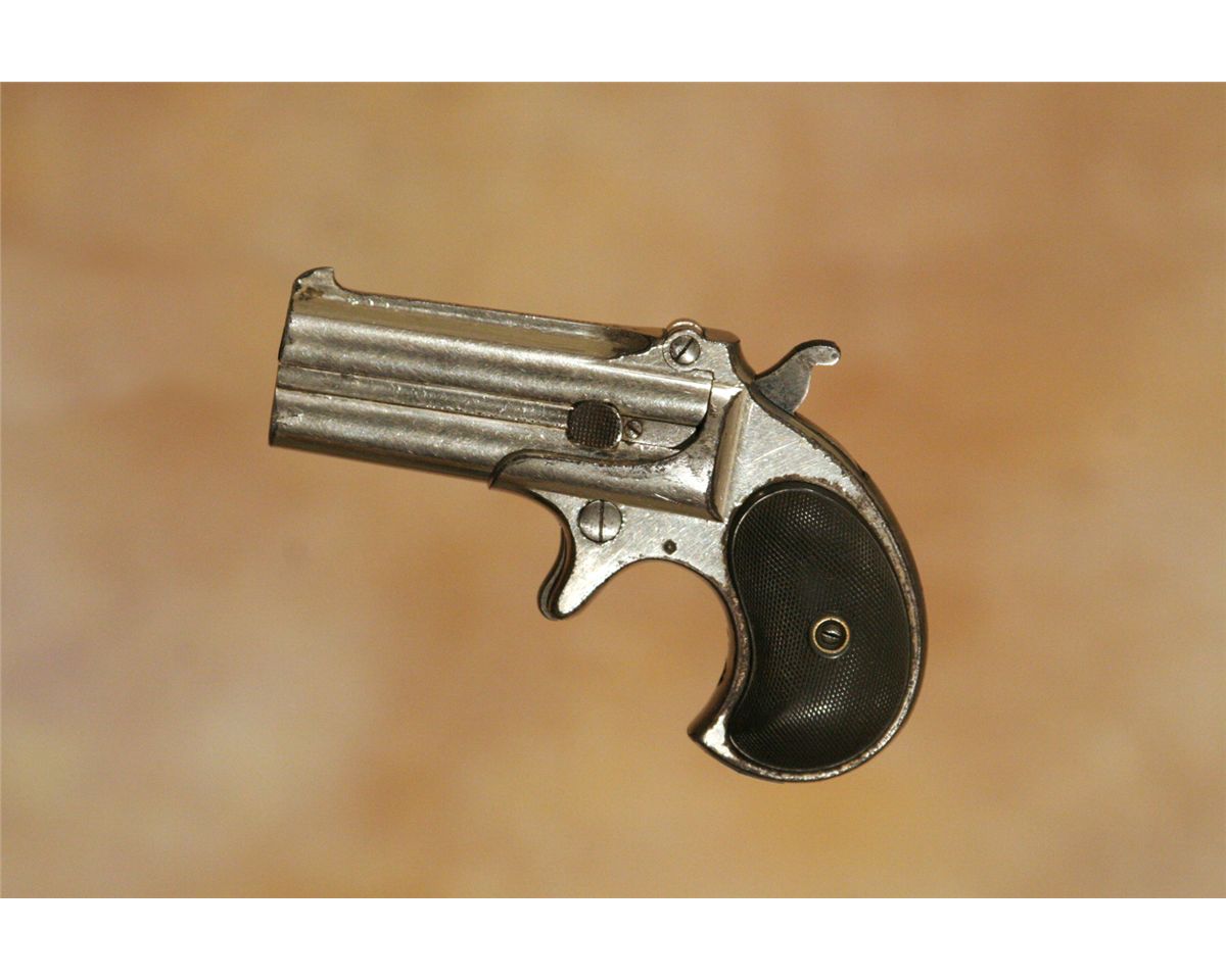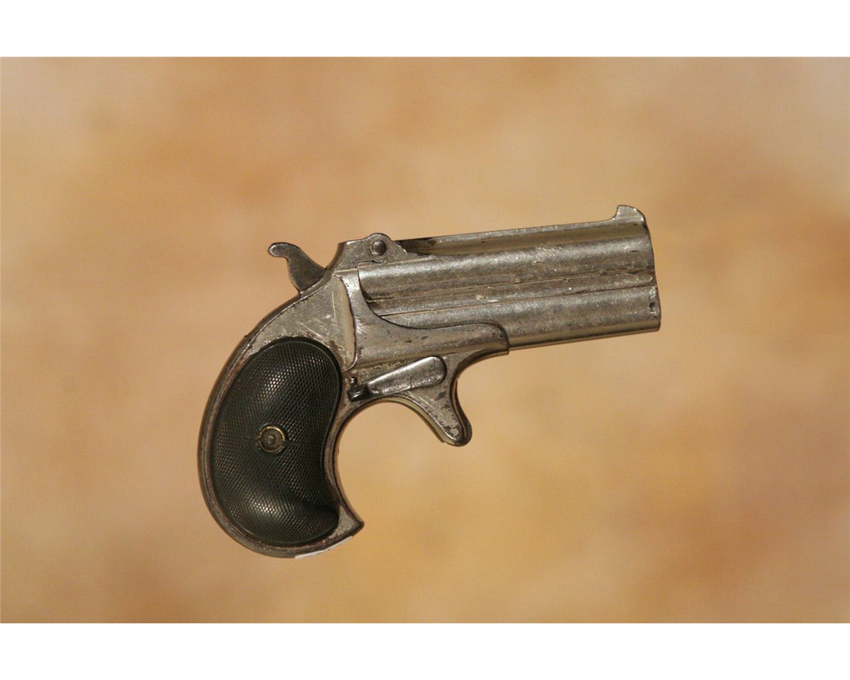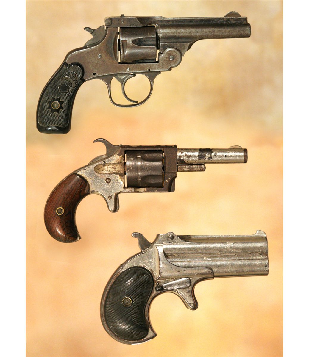 Three Antique Hand Guns. 1. Forehand Arms Company double action pistol. 3 .25" barrel .38 calibre with hard rubber grips. 2. Hopkins and Allen 5-shot pistol. 2 .75" barrel. .32 long calibre. 3. Remington Arms Company over-under derringer. 3.125" barrel. .41 calibre, nickel plated. All 19th century.