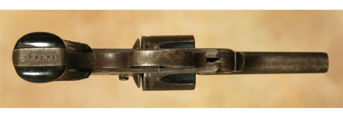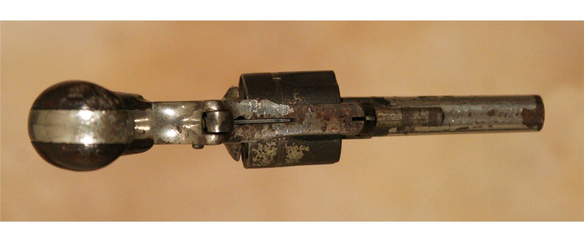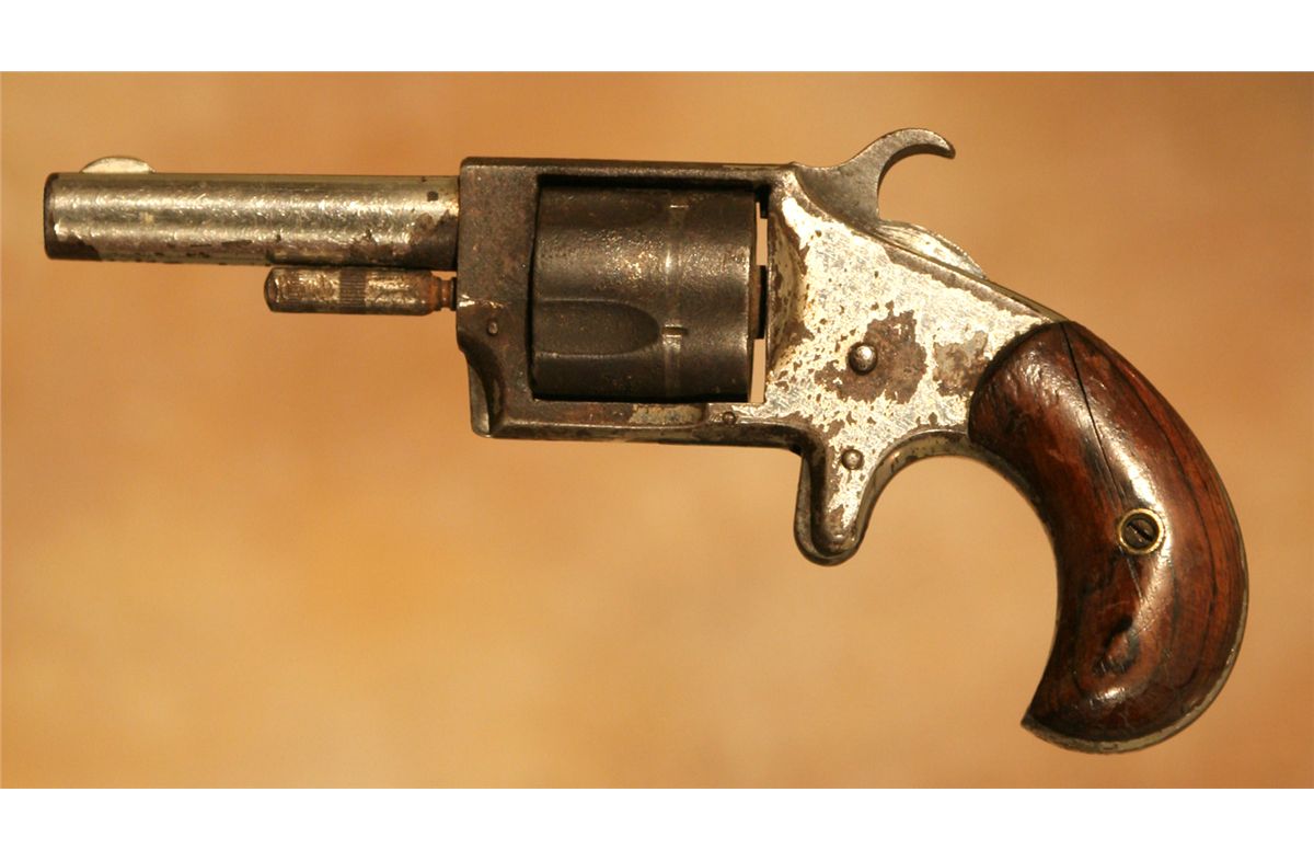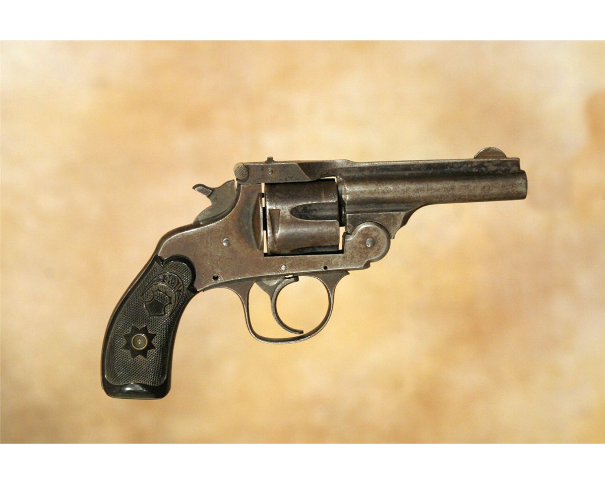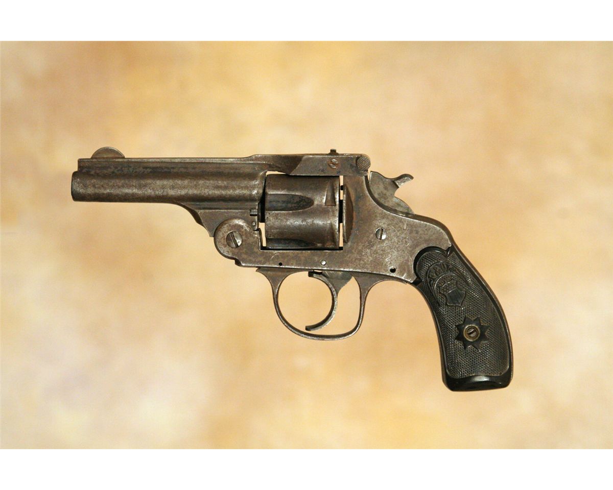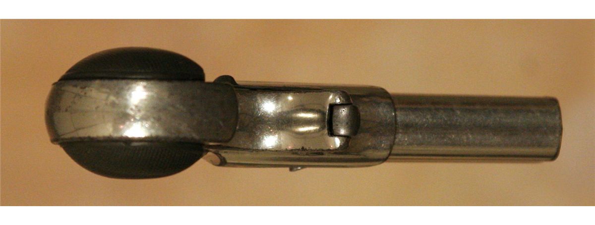 Three Antique Hand Guns. 1. Forehand Arms Company double action pistol. 3 .25" barrel .38 calibre with hard rubber grips. 2. Hopkins and Allen 5-shot pistol. 2 .75" barrel. .32 long calibre. 3. Remington Arms Company over-under derringer. 3.125" barrel. .41 calibre, nickel plated. All 19th century.