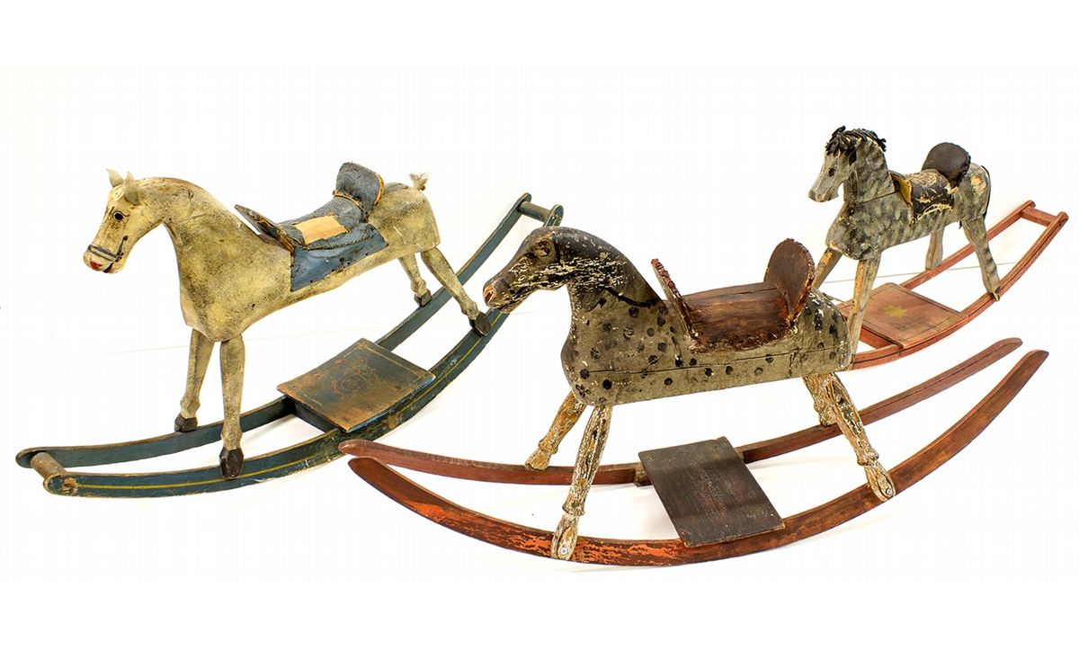 Three nice antique rocking horses. A) Crandall rocking horse with horse hair tail; b) Spotted Horse from Wisconsin, c 1850’s; c) horse of unknown American heritage. All apprea circe 1850’s or before. Repairs, etc. Please inspect. - HKA#66352
