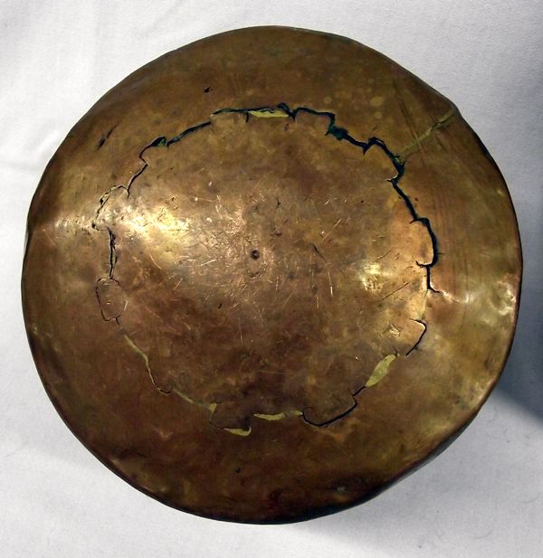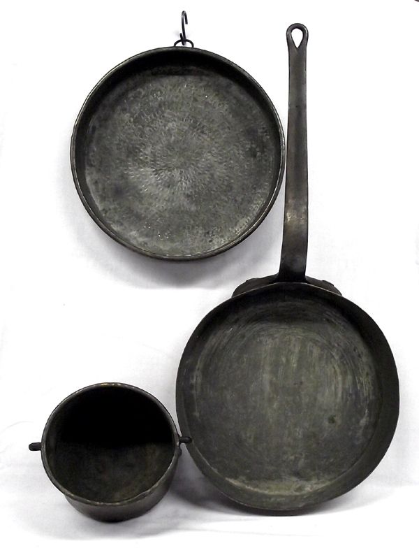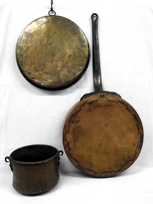 Three Antique Worked Copper Cook Ware Collectibles. Heavy large frying pan measures 3.25'' H x 14.75'' diameter with 15'' long handle, hole for hanging. The worked baking pan measures 13.75'' diameter and has hanging loop. The pot measures 5.25''H x 8'' diameter. Fancier loop handles on sides and bottom has wear along with dents and nice patina. Very heavy! Very cool!