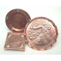 Three Arts and Crafts copper dishes, comprising a Newlyn square stand with fish and shell embossed corners signed 'H Dyer', 5.75ins; a circular scalloped dish embossed with a peacock, 10ins, and another, £100-150