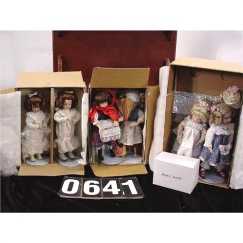 Three Ashton-Drake Dolls sets and a very nice wooden shelf. First Dolls are Cinderella in Rags and Little Red Riding Hood number 93853, both dolls in great condition and measures 8 inches in height. Second dolls are called "Horrid/Good Girl" number 93855 they too measure 8 inches high and are in great condition. Final set of doll are called "Mary, Mary/ Goldilocks" 8 inches tall, good condition, number 93851. All three boxes weigh a combine total of 3 lbs 14 oz. Wood shelf has three layers to display dolls, is in very nice condition without any damage. Shelf measures 30 inches high and 18 inches across and weighs 8 lbs 15 oz. [81]