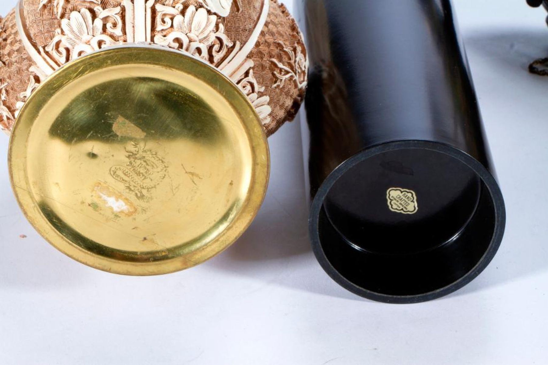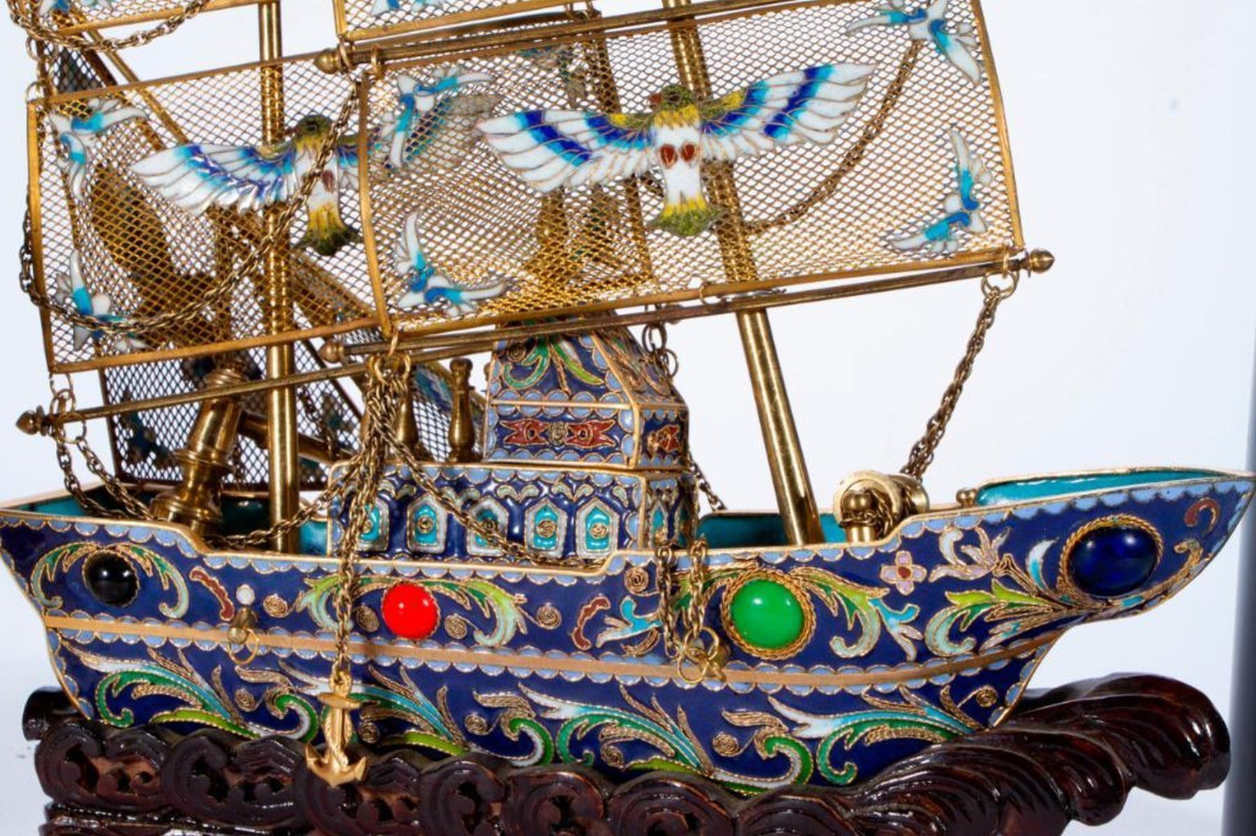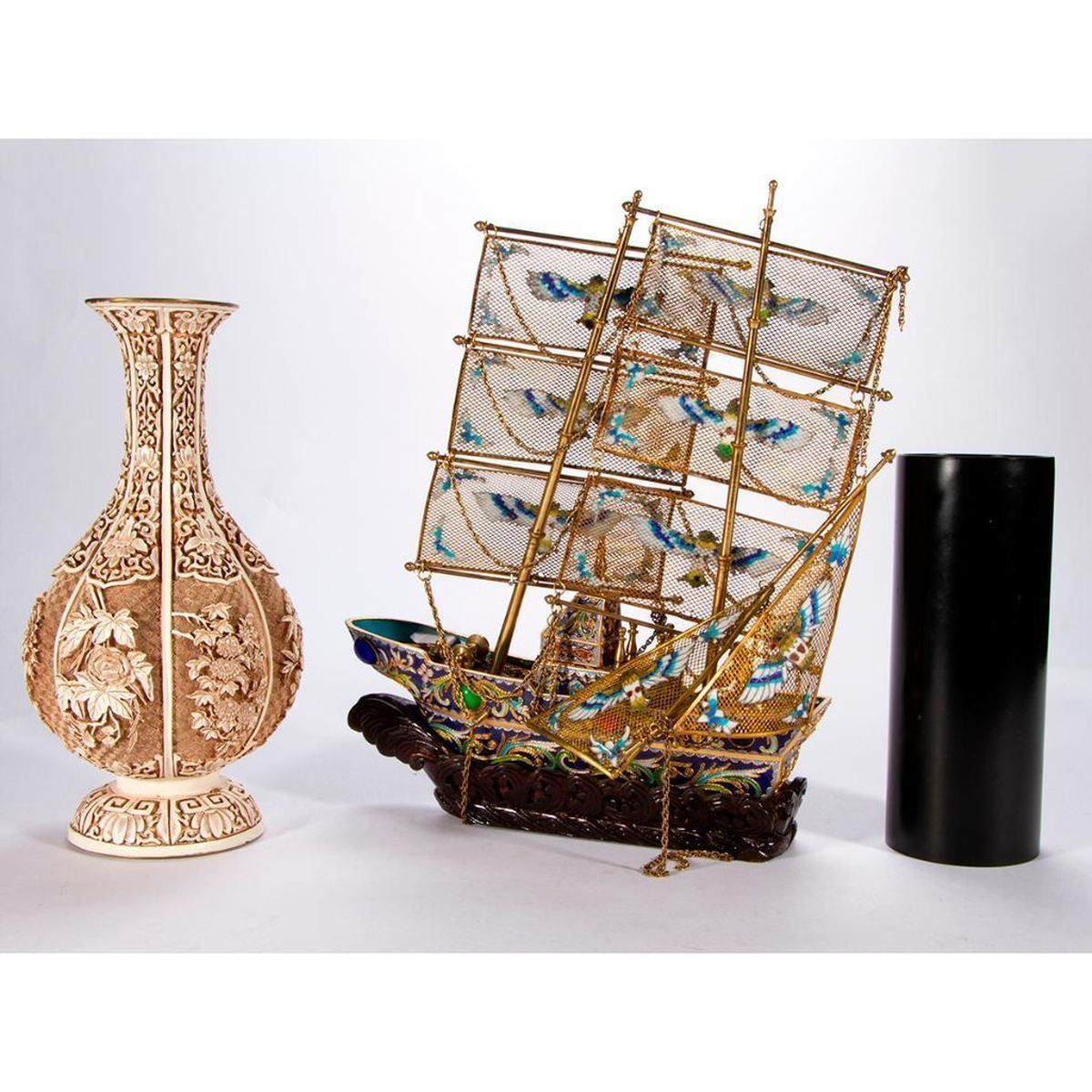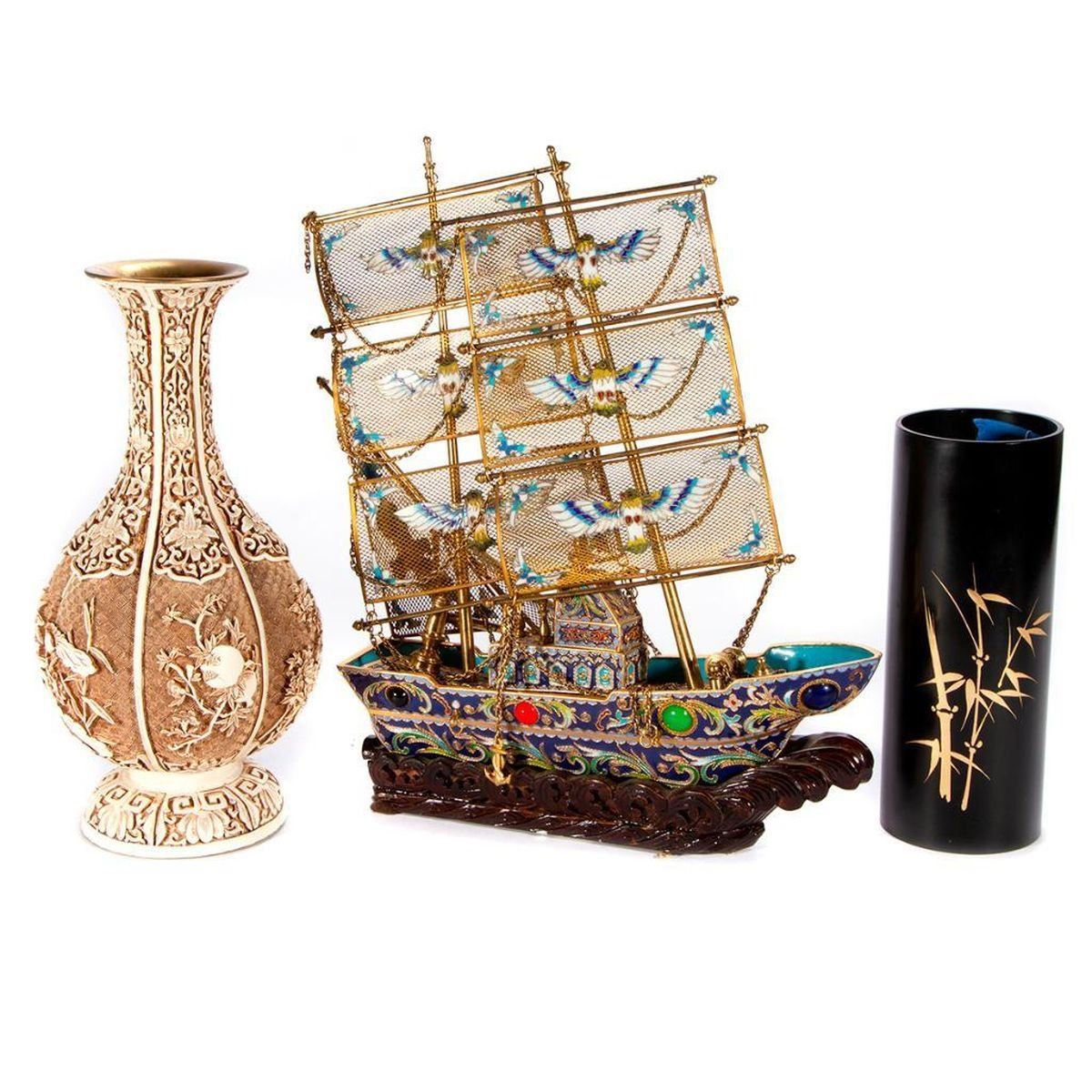 A brass and enamel ship model on stand, a faux ivory vase and a bamboo painted vase. H Ship - 15". Condition: Good.