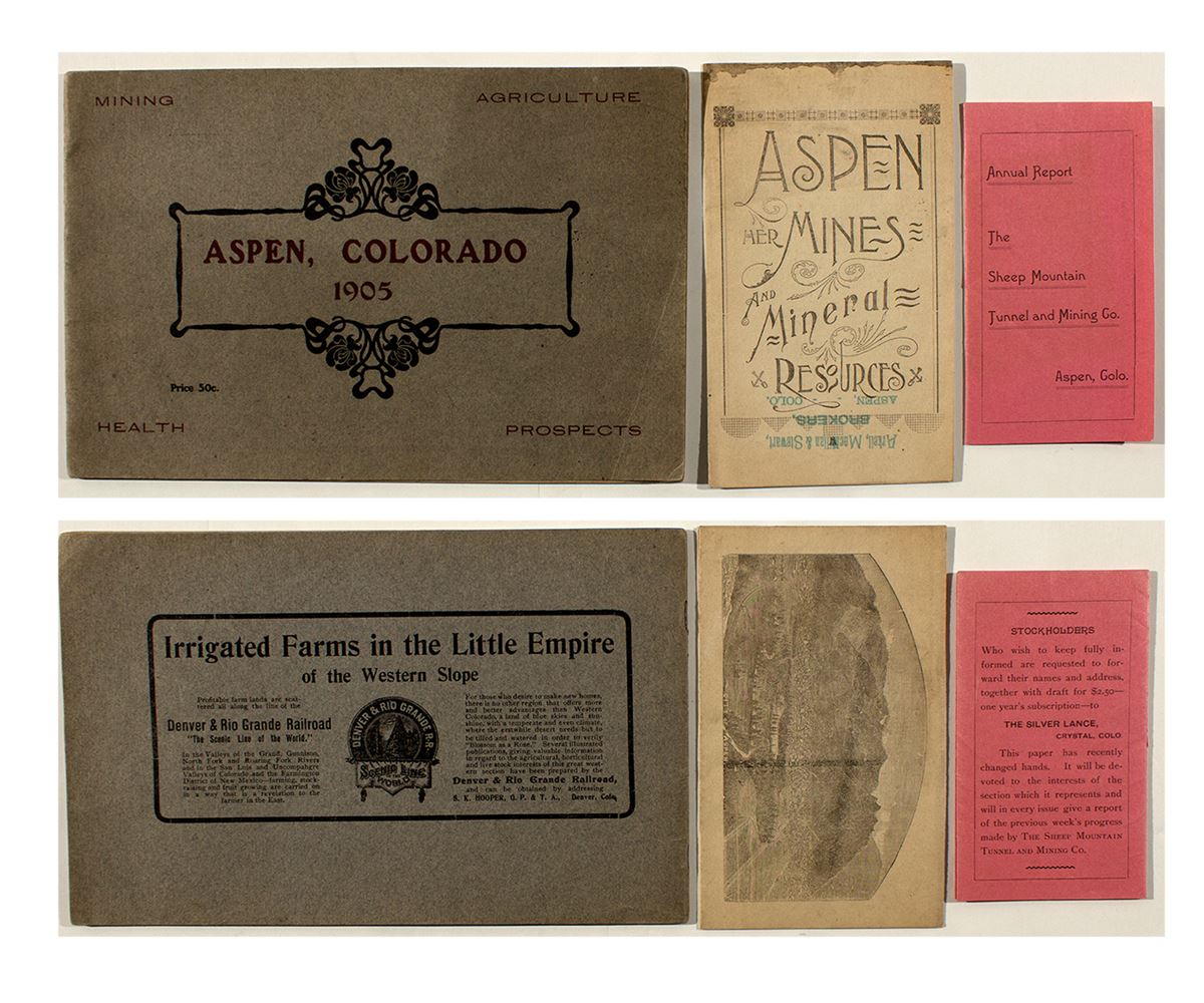 1) Annual Report for The Sheep Mountain Tunnel and Mining Co., Aspen, Colo. c.1894. Mines located on Sheep Mountain, Gunnison County. 16 pages (folded, 8 front and back) detailing the first two years incl. ledger balances, statement of receipts and disbursements, and statement of assets and liabilities. Pink paper. 5.5" x 3" 2) Aspen, Her Mines and Mineral Resources. Pamphlet printed by the Aspen Times. Stamped Arkell, MacMillian & Stewart, Brokers, Aspen, Colo. 10 panels (5 pages folded), including lithograph of the city. Detailed description of the county and the mining companies there. c.1892. 6.75" x 4" with some staining. 3) Fabulous booklet advertising the city: Aspen, Colorado/ 1905/ Mining/ Agriculture/ Health/ Prospects. Softcover with stapled binding. 34 pages. List city officials and officers. Describes the mining, tourism, and agricultural industries. Last 20 pages is a review of the city's prominent mercantile, professional and other agencies. 6.5" x 10"