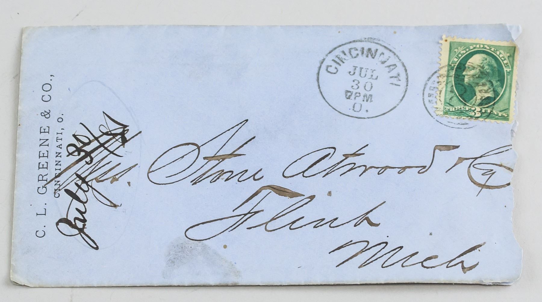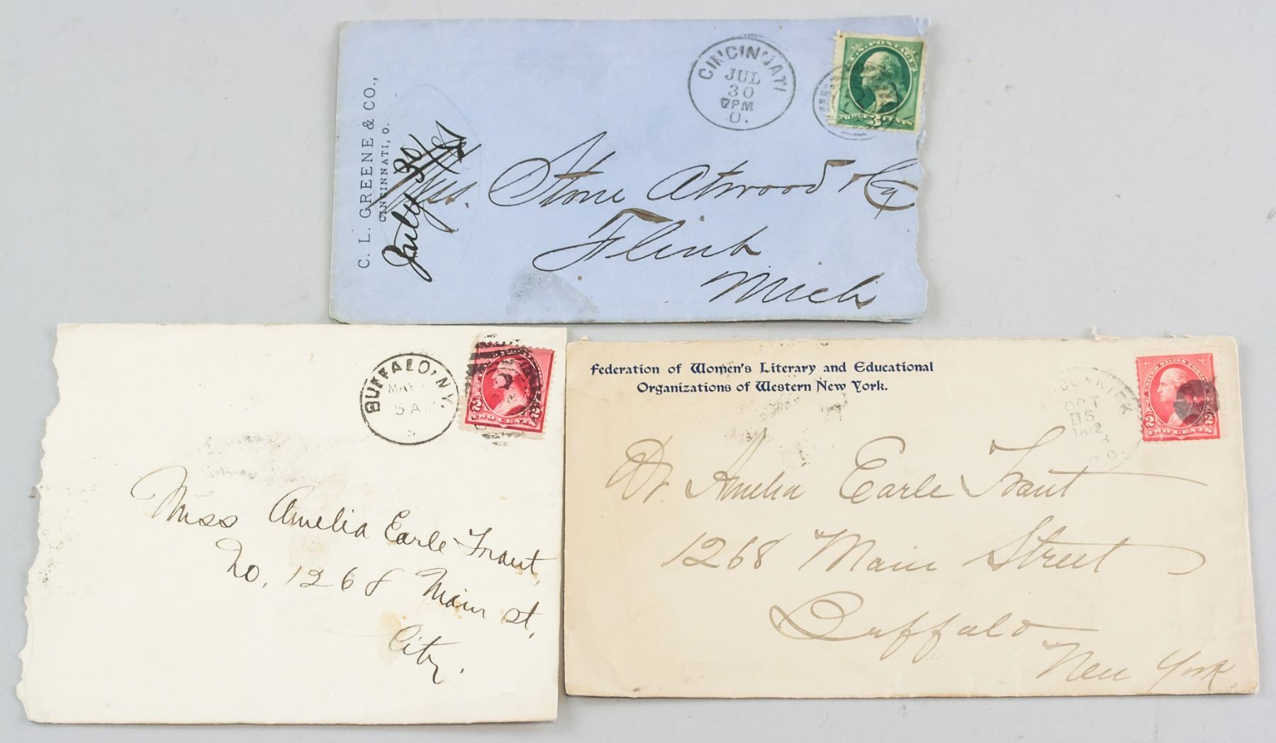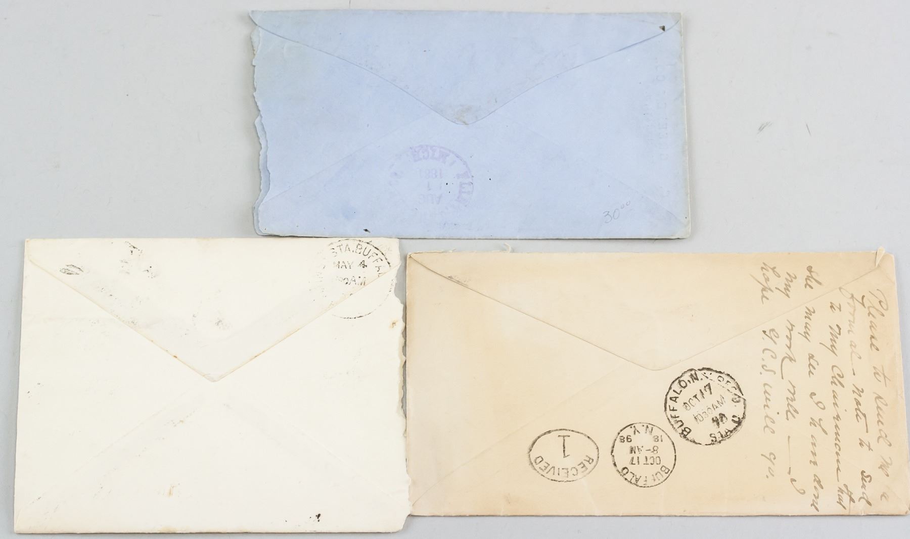 Three (3) assorted American stamps. On envelopes stamped 1898, 1881. 10 x 16.5 cm each