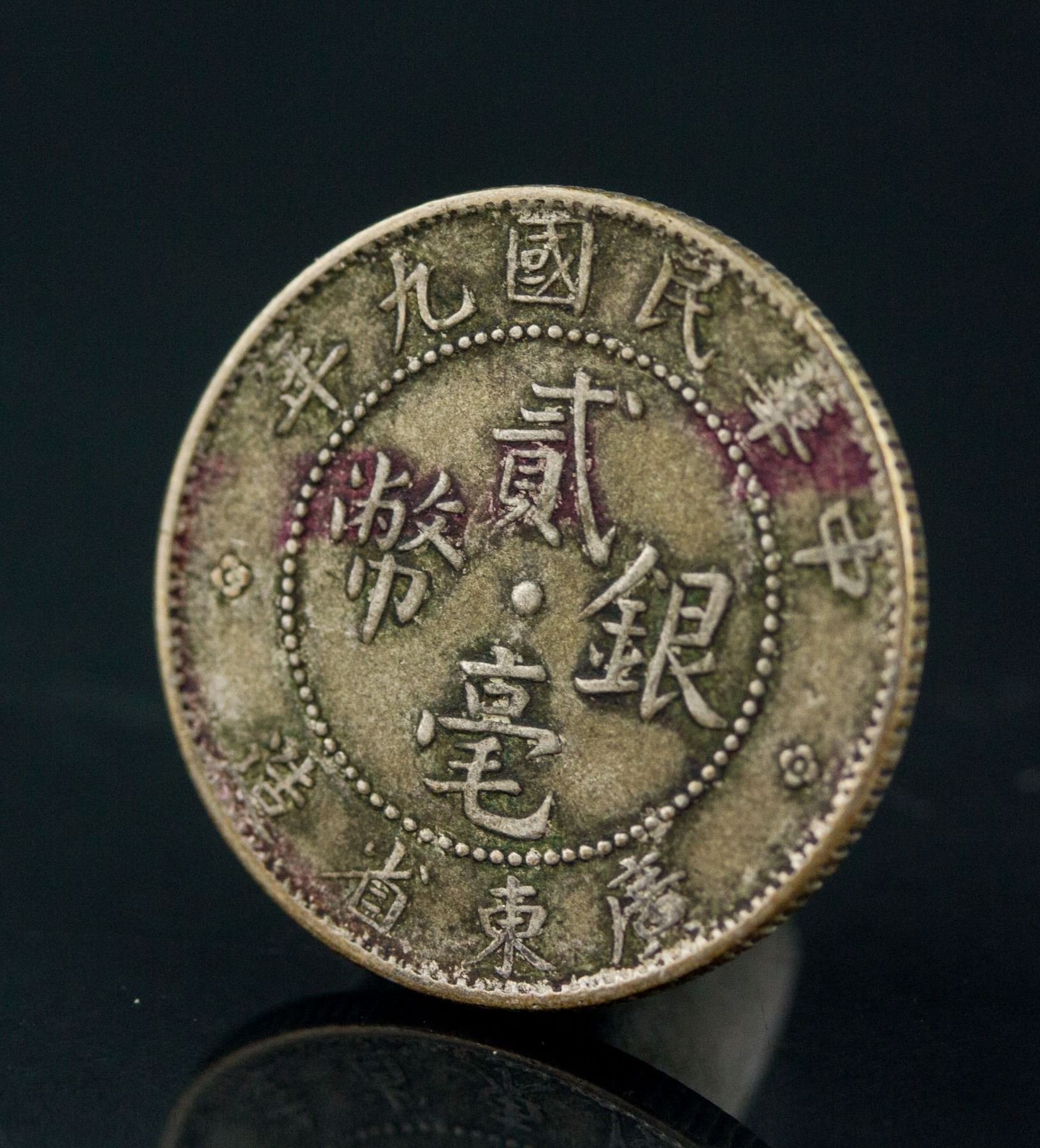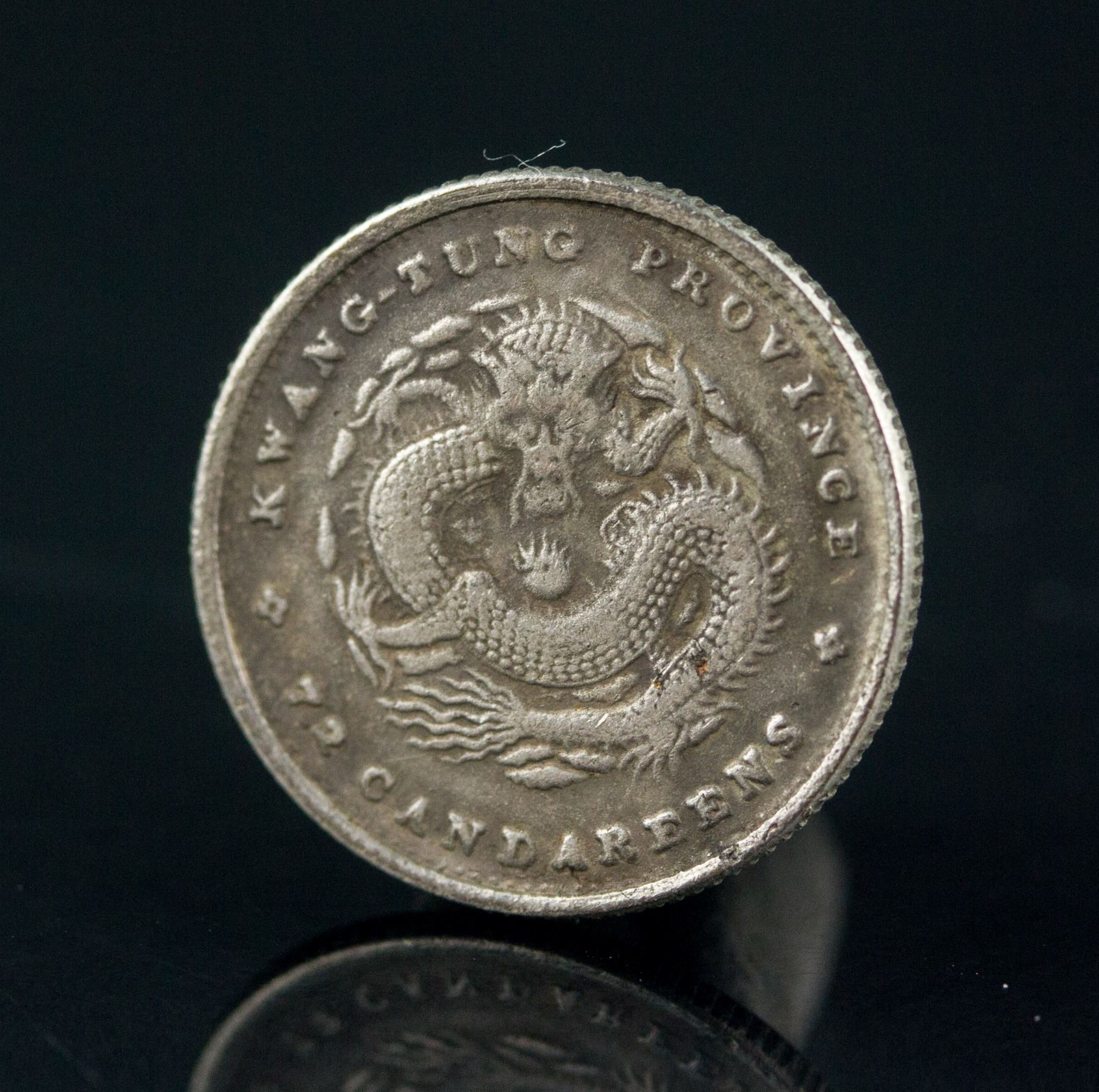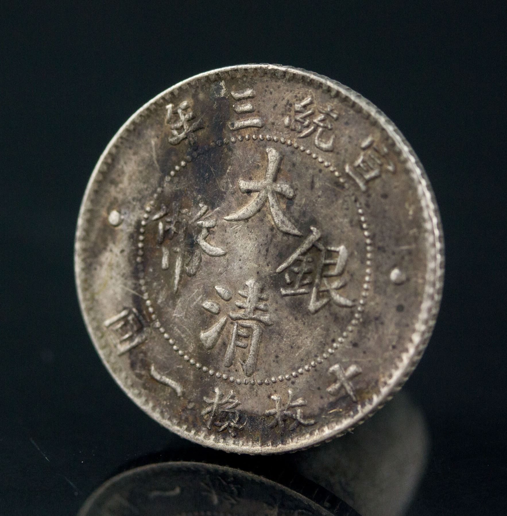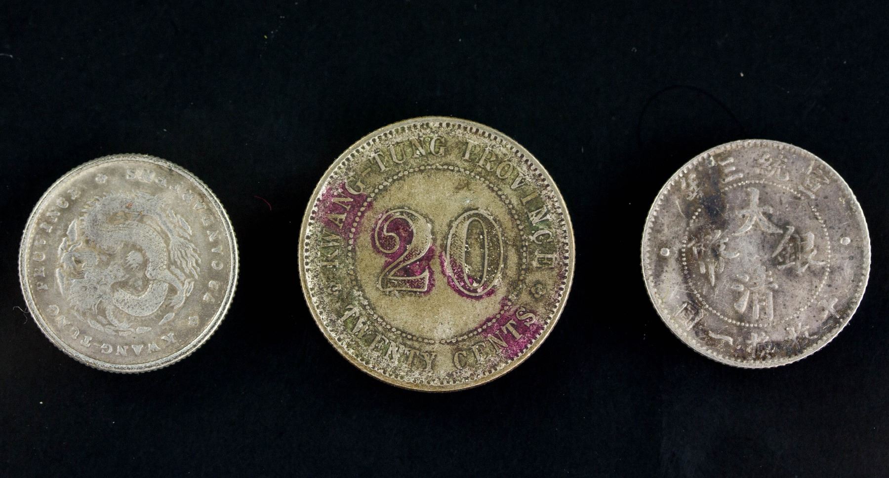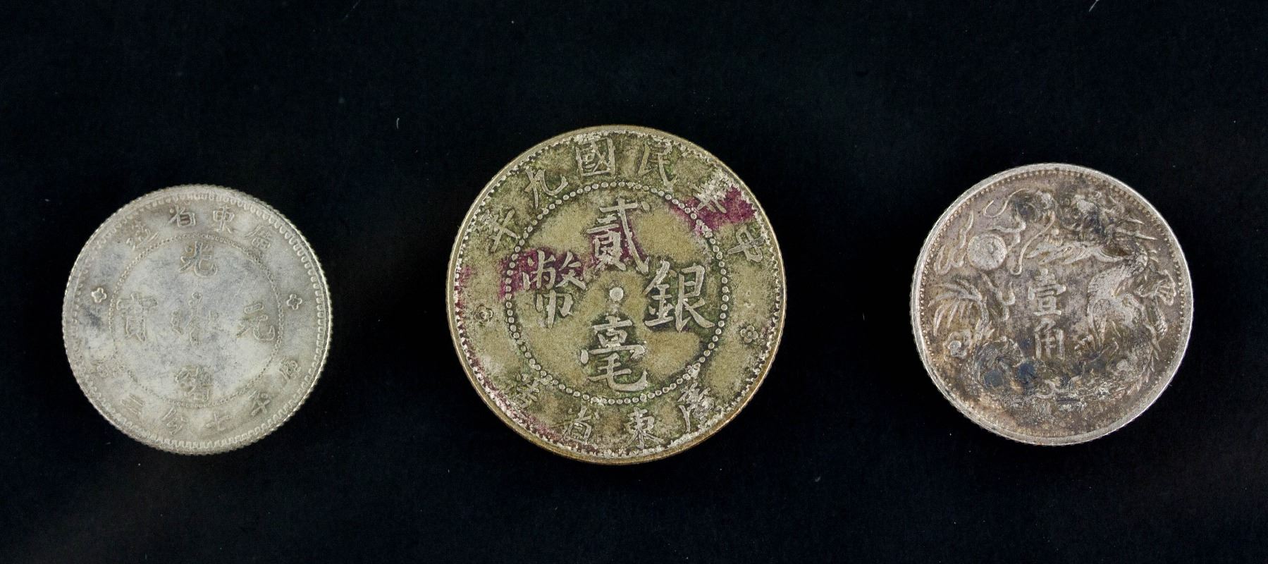 Three (3) assorted Chinese silver coins; of 1 Guangxu Yuanbao, one Republic 9 year coin and 1 Xuantong Daqing Yinbi coin; D: 2 cm, 12 grams