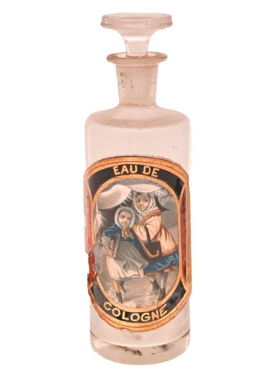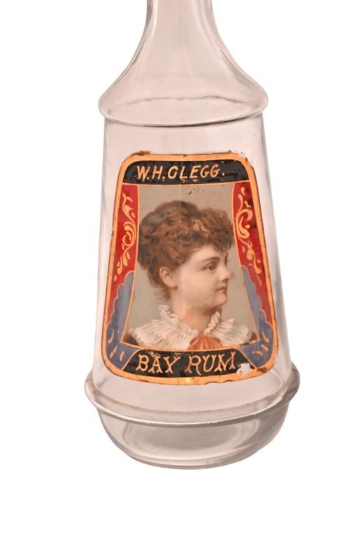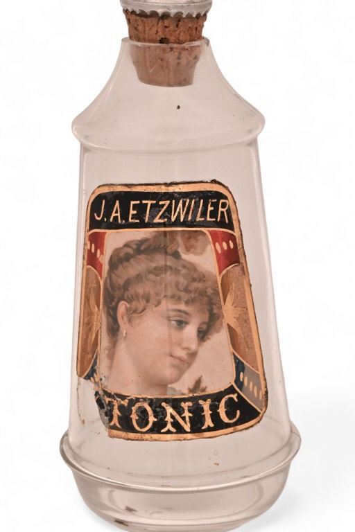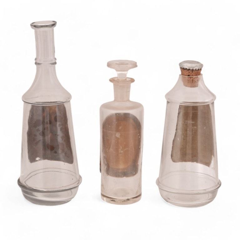 Three (3), Label Under Glass Barber Bottles. The neck of the Tonic Bottle on the right has been cut off. 6 1/2", 6 3/4" & 9 3/8" tall.