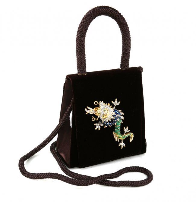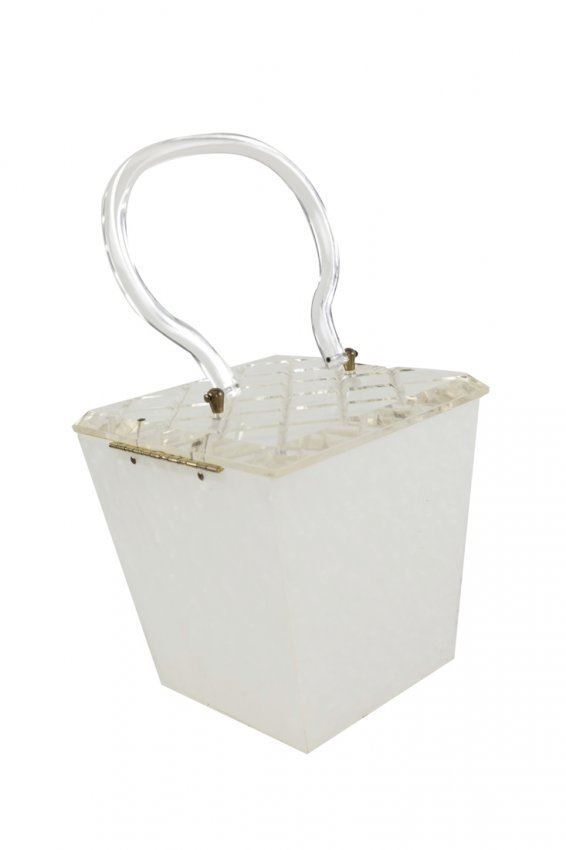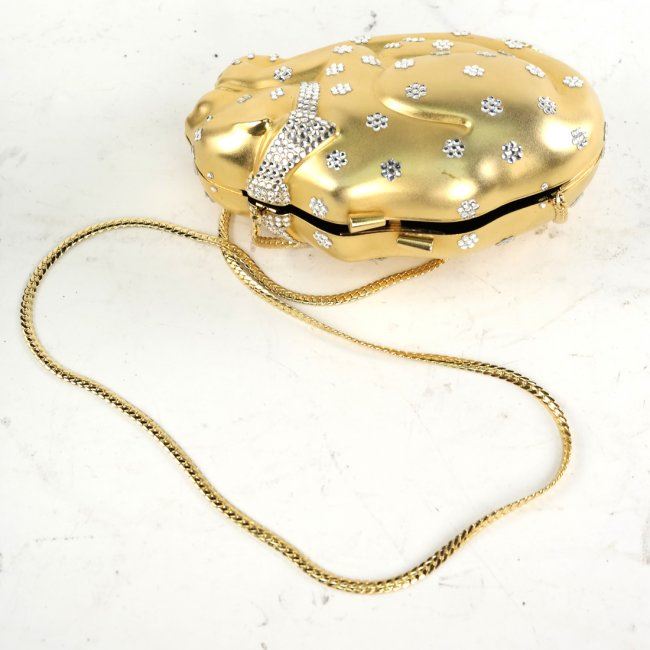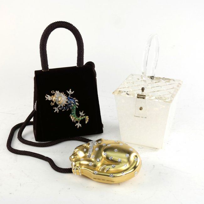Comprising: 1.) Gold cat-form clutch. 2.) Pocketbook with clown pin attached. 3.) Frosted acrylic pocketbook. [5 1/2" x 5 1/2" x 5 3/4" H]. In overall good condition.