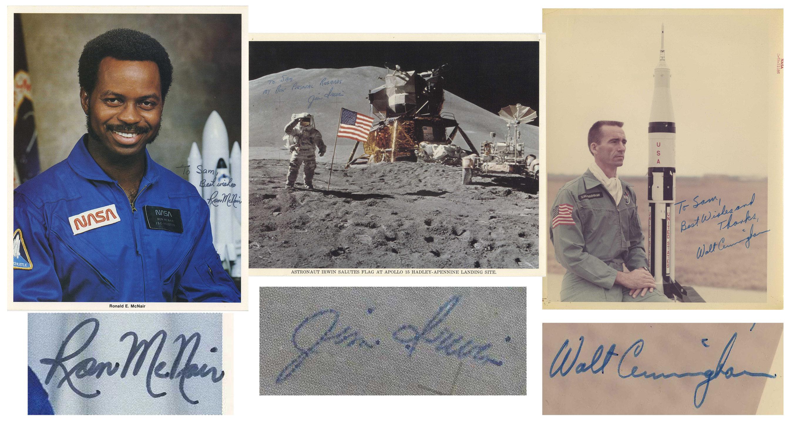 Excellent lot of three separate signed photos, including: (1) Apollo 7 Lunar Module pilot Walt Cunningham 8'' x 10'' glossy photo, inscribed in blue ink: ''To Sam, Best Wishes and Thanks, Walt Cunningham''; (2) Challenger astronaut Ron McNair 8'' x 10'' matte photo, inscribed in felt pen, ''To Sam, Best Wishes Rob McNair''; (3) Jim Irwin, Lunar Module pilot for Apollo 15, signed 10'' x 8'' matte photo. Inscribed, ''To Sam My Best Personal Regards / Jim Irwin''. All photos in near fine condition.