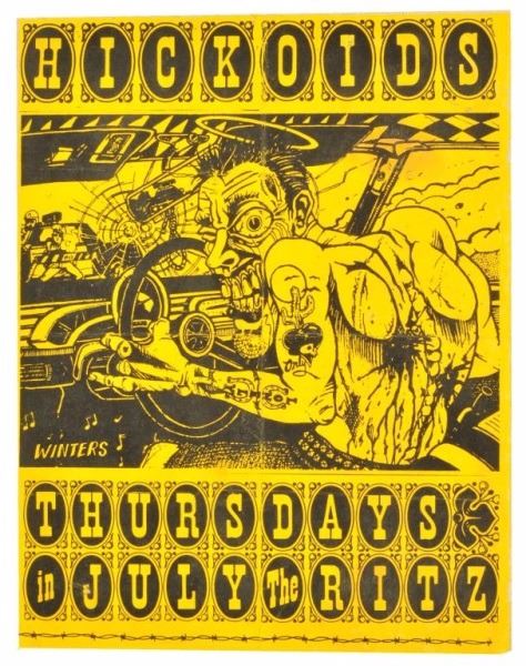 The Hickoids, Linen backed. Artist unknown. 8-1/2" x 11". Insecticide Hand Colored, one of a kind & Last Will Handbill 1980s. Artist: Chills. 9" x 11". Eastern Bloc Poster Austin, TX. 1989. Artist: Frank Kozik. 11" x 17" The Insecticide Poster is a hand done one of a kind.