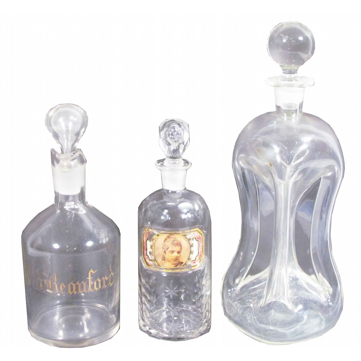 Three Back Bar Bottles. Label under glass, Old Beauford and Unique shape with ground glass lid and stopper. No chips or cracks. Tallest bottle measures 12 1/2 inches tall.