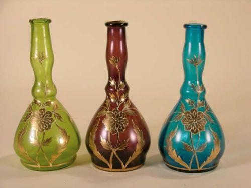 Three applied gold flowers barber bottles, olive/purple/aqua. Ex. cond.