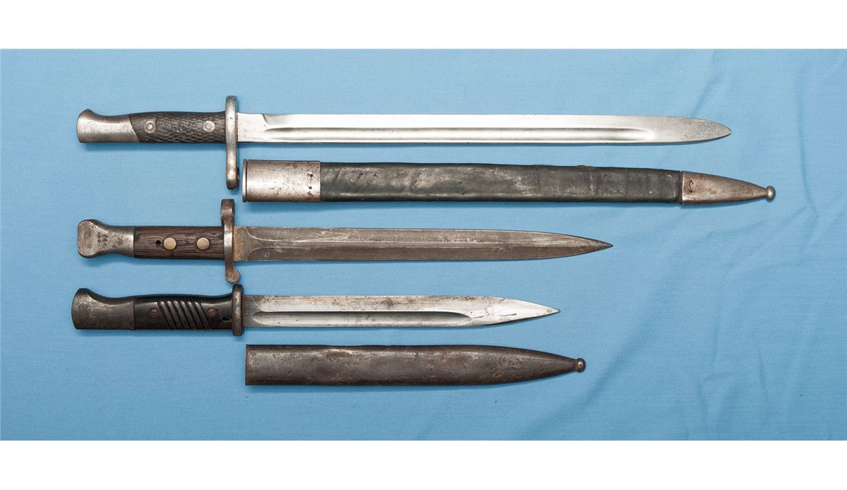 1) 15 1/2 inch blade and a leather scabbard. 2) 10 inch blade and metal scabbard. 3) 2 inch blade. CONDITION: Fair overall.