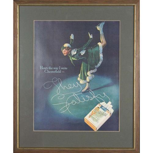 <table width="100%" border="0" cellspacing="0" cellpadding="4"><tr><td><em> </em></td></tr><tr> <td width="100%"> **1** This is an old advertising print for Chesterfield cigarettes. This is a very good example of the typical advertising art of the 1920?s and 30?s and is in very good condition. The picture is appealingly matted in a gray colored mat that compliments the green dress of the skater. The print itself measures 12? x 9.25? but measures 16.75? x 13.75? after it is matted and the attractive dark stained wood frame trimmed with gold colored accents is added. The picture is handsomely framed, matted, and beautifully preserved.