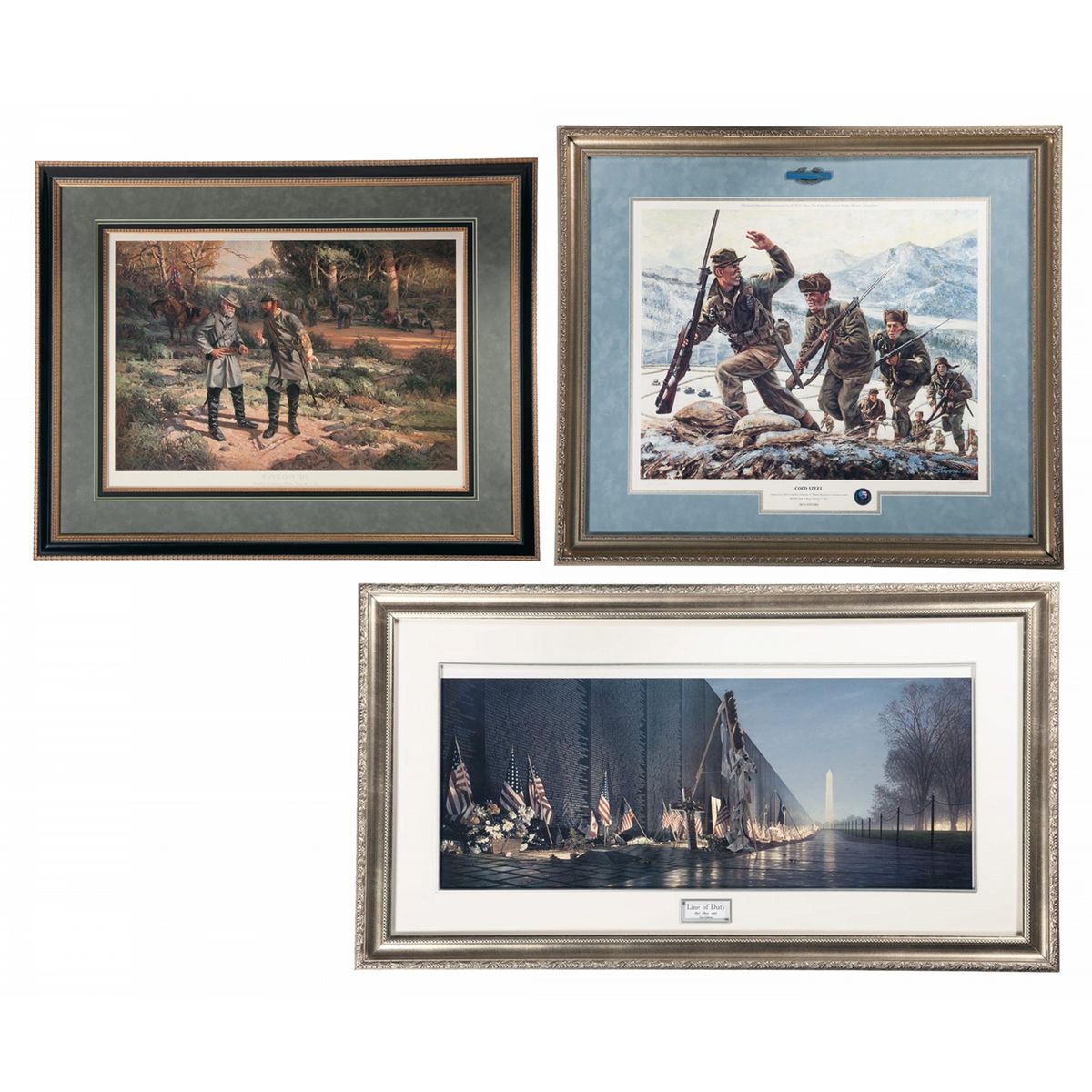 1) Limited Edition framed print, "We've Got Him", 3rd in the series of Lee's Peninsular Campaign. Issued circa 1996, 35 inches tall by 44 inches wide, signed Robert Summers 450/950. 2) Limited edition framed Print commissioned by WPMA, class of 2000, "Cold Steel" by Don Stivers, dated 2000, 56/400, depicting the 27th Infantry Regiment, Easy Company's bayonet charge up hill 180, North Korea. 33 1/2 inches wide x 29 1/4 inches tall. A Combat Infantry Badge is secured to the matting. 3) Limited "First Edition" framed print, "Line of Duty", by Rod Chase, depicting the Vietnam War Memorial, 44 inches wide, 24 inches tall.