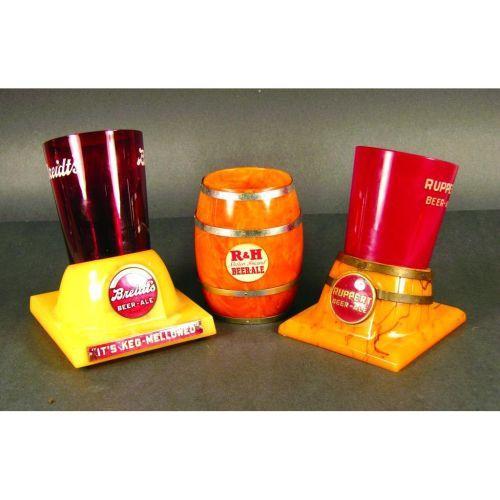Three Beer Store Displays. Made of Bake-lite for Breidts, Ruppert and R & H. Excellent Condition. Barrel in center is 5 inches tall.