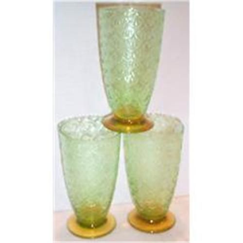 We are offering you three (3) Fantastic and quite RARE Footed Bi-Colored Turkey Track Goblets. Each Goblet has a green bowl and a very lovely amber foot and each one is in SUPERIOR condition with no chips, cracks, or dings. Each tumbler measures 2.625" in diameter and stands 7.875" tall.