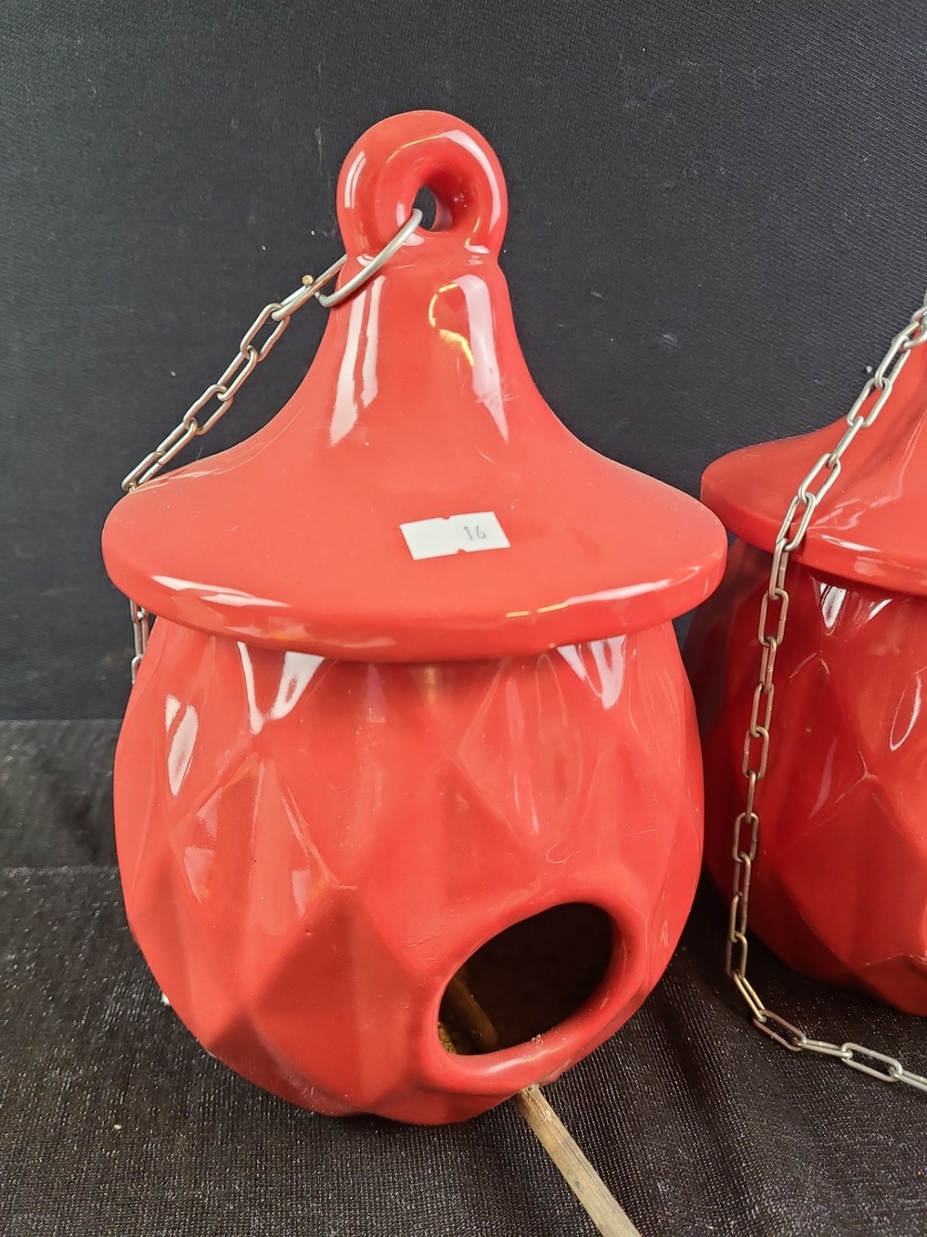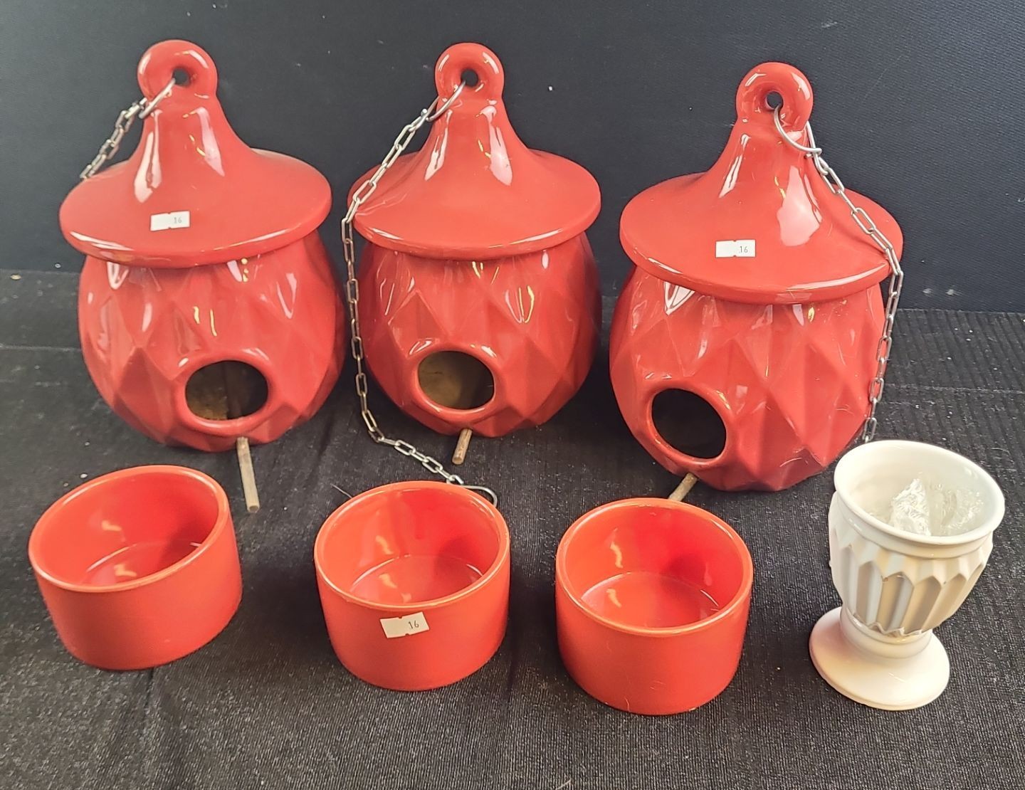 Three Birdhouses 7" Diameter, 10 T, Three Bowls 4" Diameter, 2 T and Goblet 2 3/4" Diameter 4.5 T