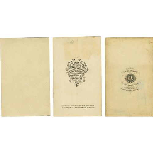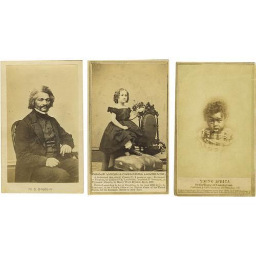 <B>Three "Black Americana" <I>Cartes de Visite</B></I>.</B></I> The first of these three images is of Frederick Douglass, the great Black American reformer who was instrumental in creating the Negro-American regiments who fought diligently throughout the Civil War. The CDV is in very fine condition; clean, crisp corners and little wear; no imprint on verso. A classic image of Douglass on titled board with his name written above his portrait not to be found often in this kind of condition. <BR><BR>The second image is of a beautiful young child, with thick ringlets and a stern expression. She is identified on the CDV as "Fannie Virginia Casseopia Lawrence - A redeemed slave child, 5 years of age. Redeemed in Virginia, by Catharine S. Lawrence; Baptized in Brooklyn, at Plymouth Church, by Henry Ward Beecher, May, 1863." Bears the Kellogg Brothers imprint on the verso. In very fine condition; light soiling on emulsion; pencil notations on verso; double lined gilt border; square corners. <BR><BR>The third image is of a young black infant, with the following text below: "Young Africa Or the Bone of Contention". This was published by Anthony / Brady and it bears their imprint on the verso. A mysterious image, likely an Anti-Slavery message, but the meaning has since been lost to us. In very fine condition; green smear visible on the verso; small blemish near the mouth of the infant; double lined gilt border; square corners; light overall soiling on emulsion. A wonderful and diverse trio.<BR><BR><b>Shipping:</b> Small Flat (<a target="_blank" href="http://www.heritageauctions.com/common/shipping.php">view shipping information</a>)