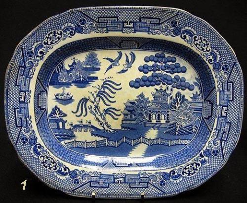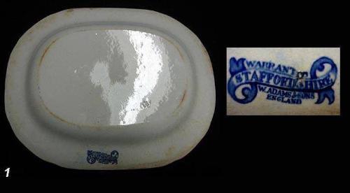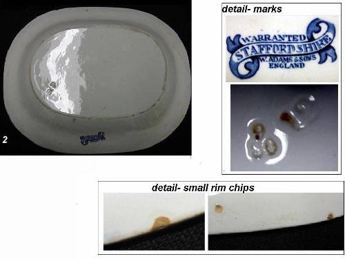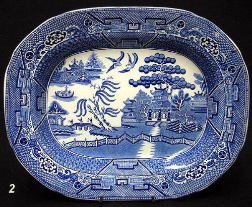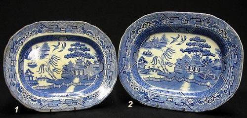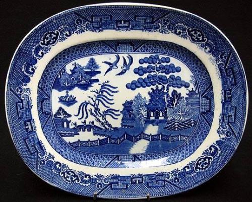 Three Blue Willow platters including two oval graduated platters marked on bottom of rim W. Adams & Sons England; 11 1/2" x 9 1/4" and 13" x 10" (large platter has three small rim flakes (from plate holder) and smaller one has slight staining); and an oval platter marked on bottom Made in England 12 1/4" x 10" (a few cut marks)