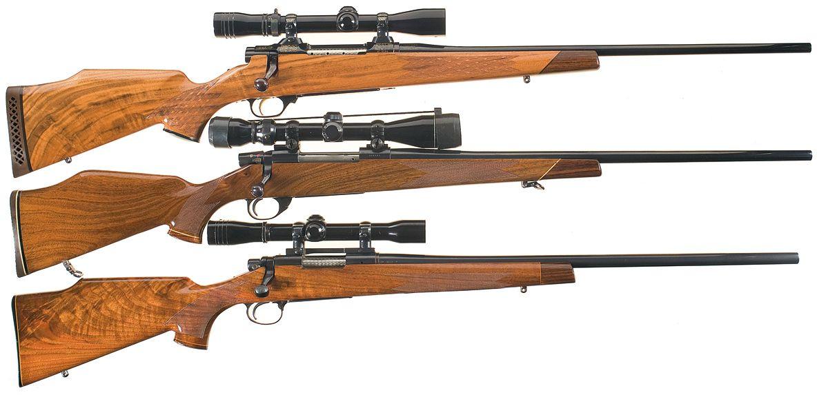 A) Standard markings and features with gold engraved filled receiver and scope rings. A Redfield 3x-9x scope is mounted on the receiver.