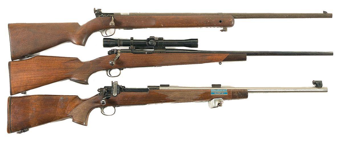 C) Manufactured between 1930 and 1940 with standard markings. Blued receiver, scope blocks on stainless steel barrel with Lyman front and rear sights. Right side of stock marked "HUT 1304/Valentini" near forend.