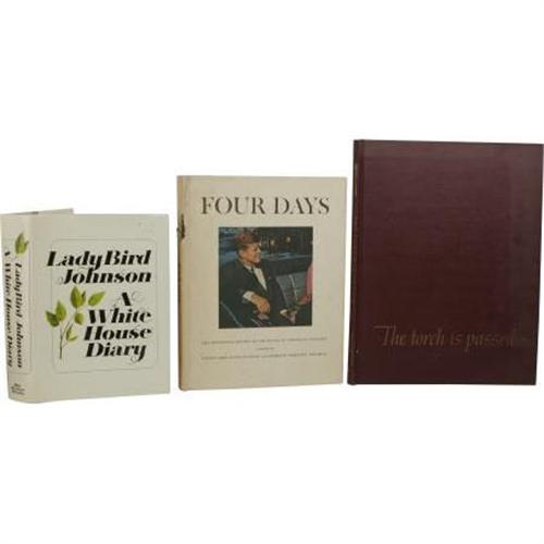 <B>Three Book Lot of Johnson and Kennedy Books</B></I> including:<BR><B>Lady Bird Johnson Signed:<I> A White House Diary.</B></I></B></I> (New York: Holt, Rinehart and Winston, 1970), first edition, 806 pages, signed <I>Lady Bird Johnson</B></I> on a bookplate on the ffep, from the LBJ Library and Museum, Austin, Texas, illustrated, green boards with white cloth self back, gilt titles, 8vo (7 x 9.25), very good condition.<BR><B>The Torch is Passed.</B></I> (No place of publication: Associated Press, no date), unknown edition, 99 pages, illustrated with black and white photos, maroon cloth with gilt titles, folio (10 x 13), boards faded and lightly soiled, old tape residue on the ffep, good condition.<BR><B> United Press International :<I> Four Days:</B></I> The Historical Record of the Death of President Kennedy.</B></I> (New York: American Heritage Publishing Company, 1964), first edition, 143 pages, illustrated, pictorial hard covers, 4to (8.25 x 11.25), 2.5 section missing from top of spine, covers lightly toned, good condition. <BR><BR><b>Shipping:</b> Books & Catalogs (<a target="_blank" href="http://www.heritageauctions.com/common/shipping.php">view shipping information</a>)