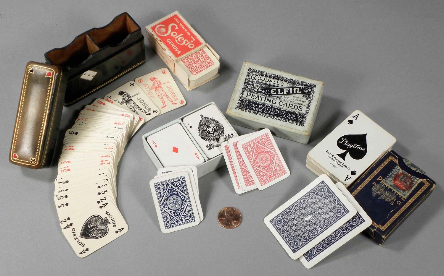 Lot of 3 Boxes of Miniature Playing Cards. Play Time in original box with paper seal, box torn and one side missing 1 3/4 X 2 1/2 inches. Goodall's Elfin Playing Cards, two sets in original box, each deck measures 1 1/4 X 1 3/4 inches. Double deck embossed leather card box, box measures 3 1/4 X 1 X 2 1/4 inches. Starting bid $40