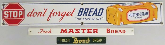 Three Bread Strip Signs including Butter Cream Bread tin sign. Master Bread tin and Bond Bread celluloid shelf strips. All in excellent to near mint condition. Butter Cream measures 28 X 4 inches.
