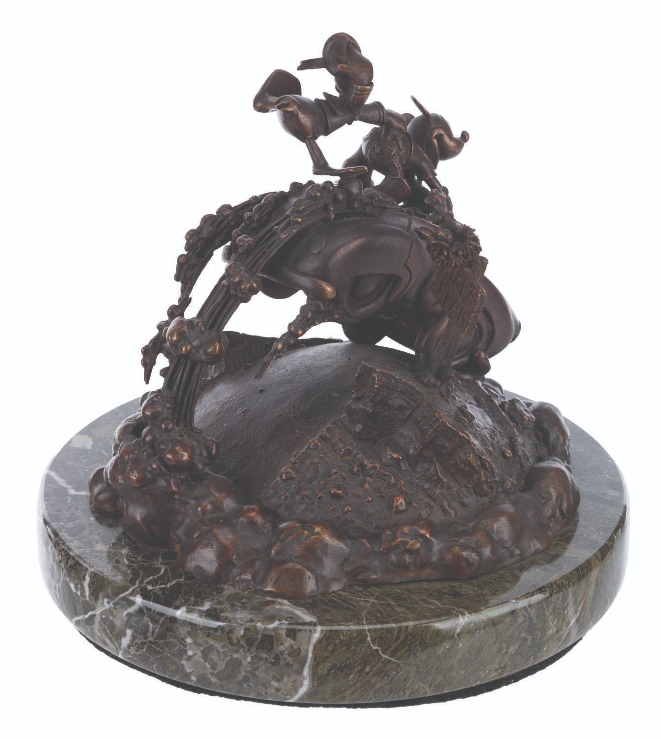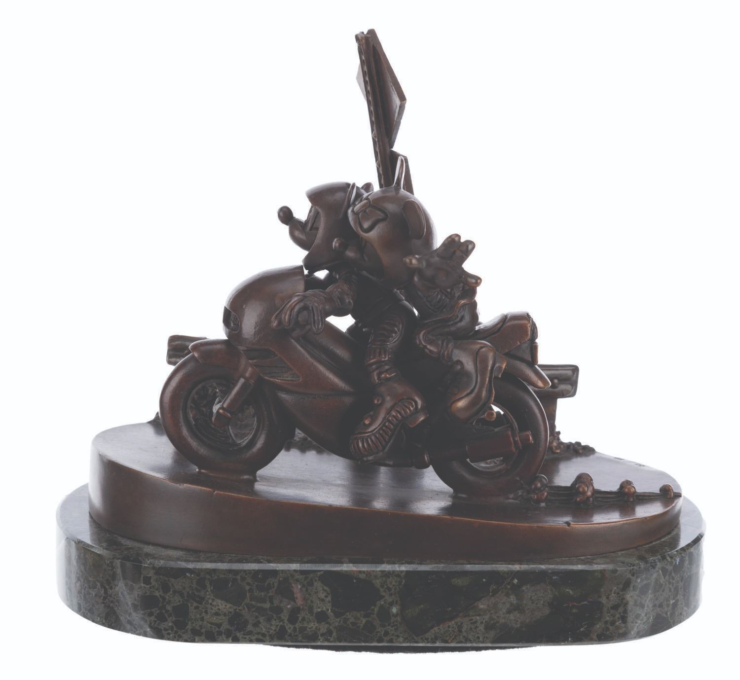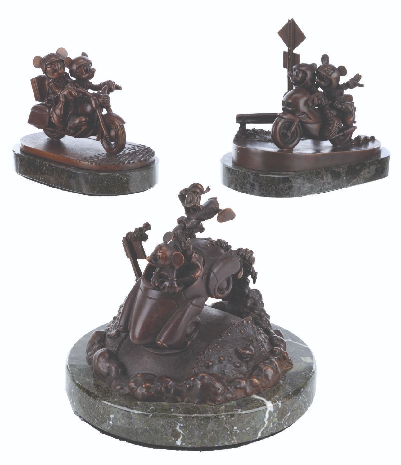 (Disney, 1990s) Three limited edition bronze sculptures mounted on marble bases featuring Mickey, Minnie, and Donald on the road. Included are, “Head Out On The Highway” artist's proof number 7 of 50, “Lookin’ For Adventure,” numbered 33 of 50, and “Over The Top” marked as limited, but unnumbered. Sculptures range in size from 6” x 3.5” x 4.5” tall to 7.5” x 7.5 " x 6.75” tall and are all in fine condition. Due to size and weight, this item requires special shipping arrangements. Please inquire before bidding.