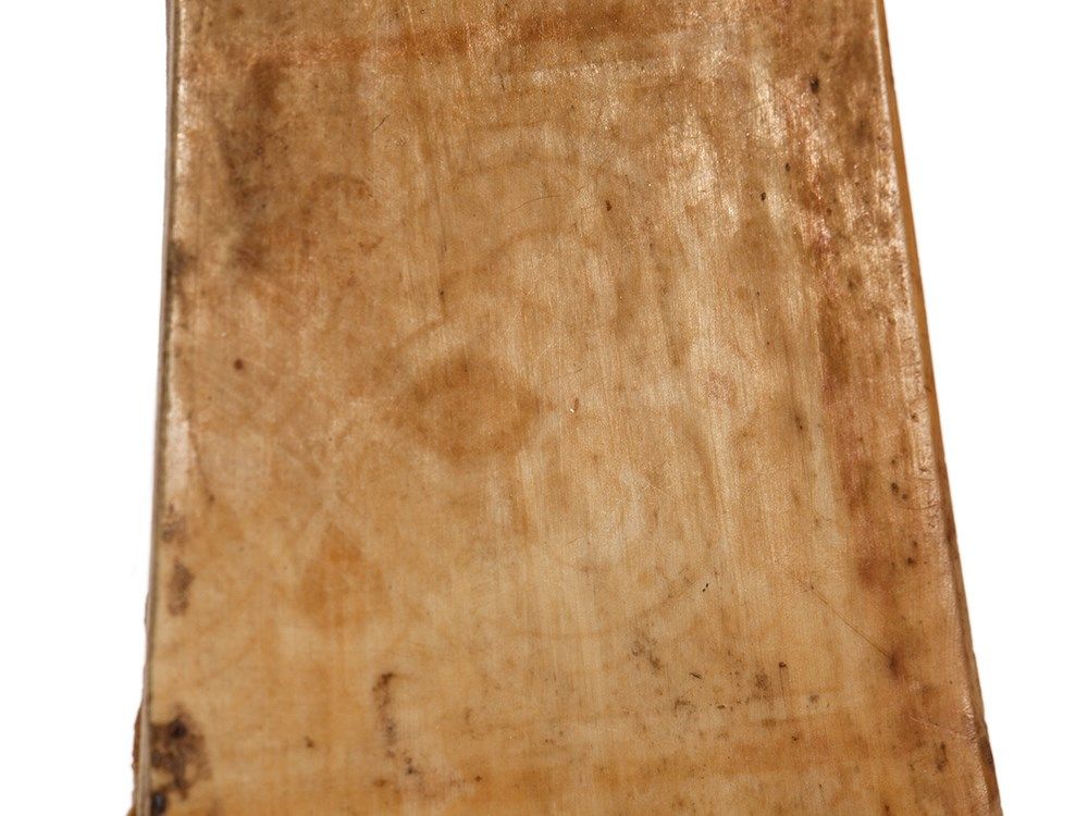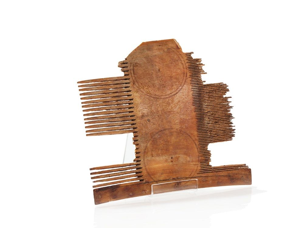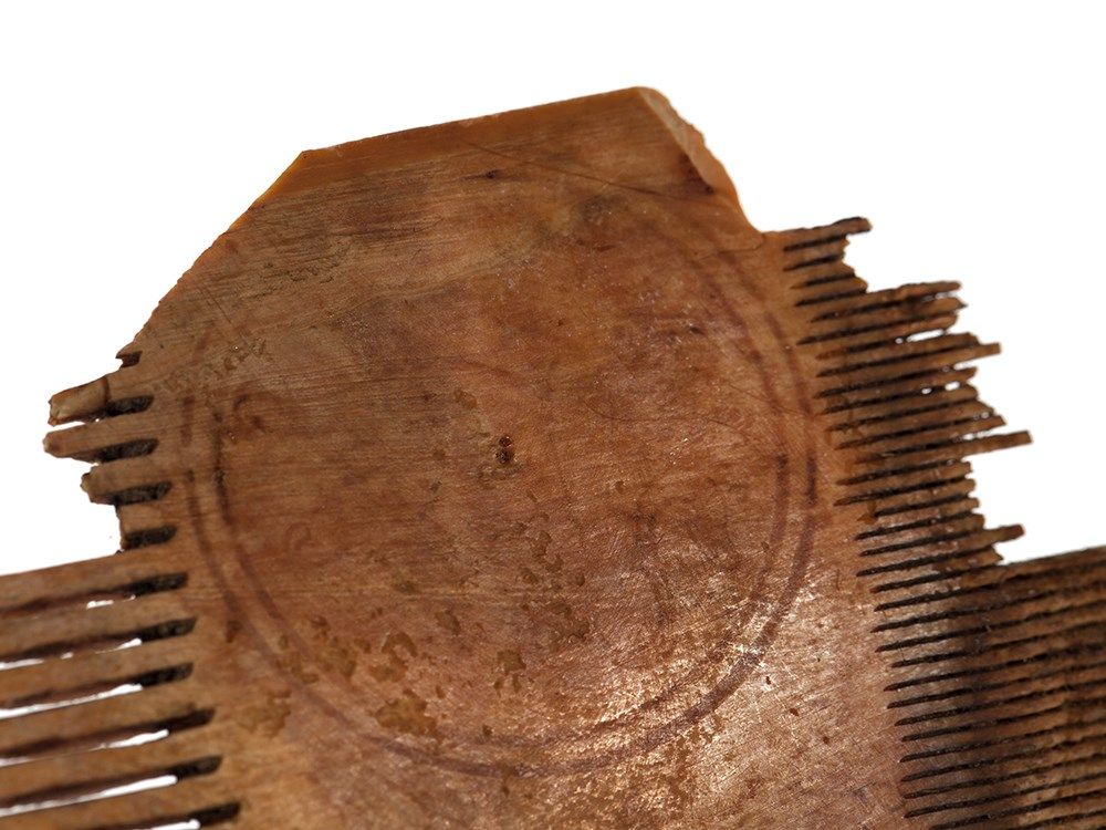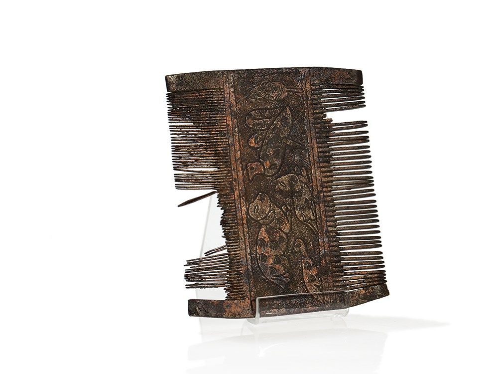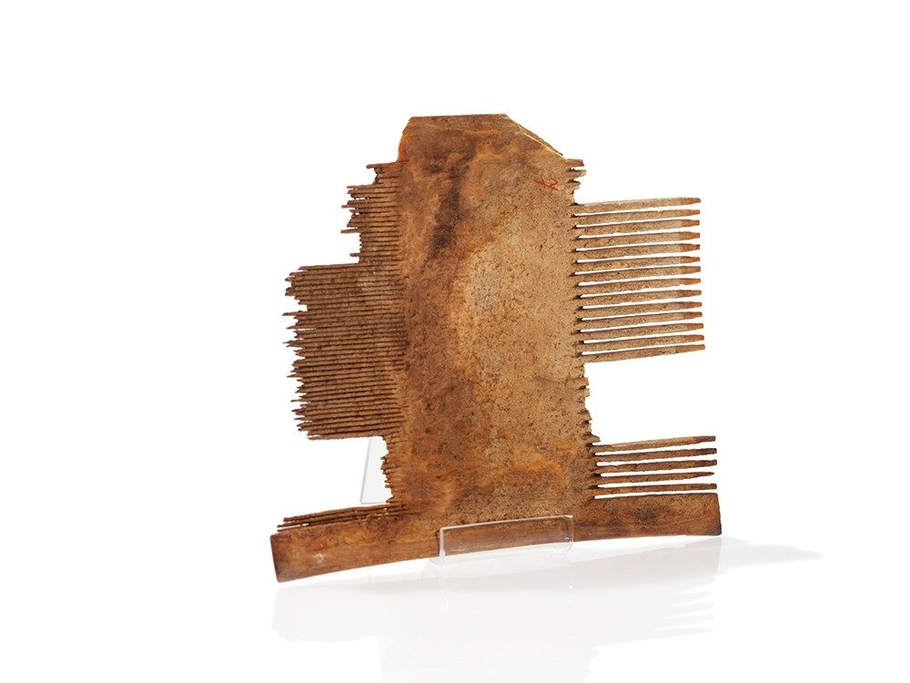 The bronze comb, made in Syria or Egypt in the 14th Century is a real little highlight. In the centre it is decorated with engraved animal motifs on both sides. The front side features a lion-like mythical creature surrounded by a floral decor, the reverse shows a dog, a fox and two birds. The comb has a very appealing patina shimmering in various nuances. In addition there are two fragmentary ivory combs which show residue of a central ornamentation. They date back to 12th Century Egypt and also have a beautiful age-related patina, giving them a particular charm.