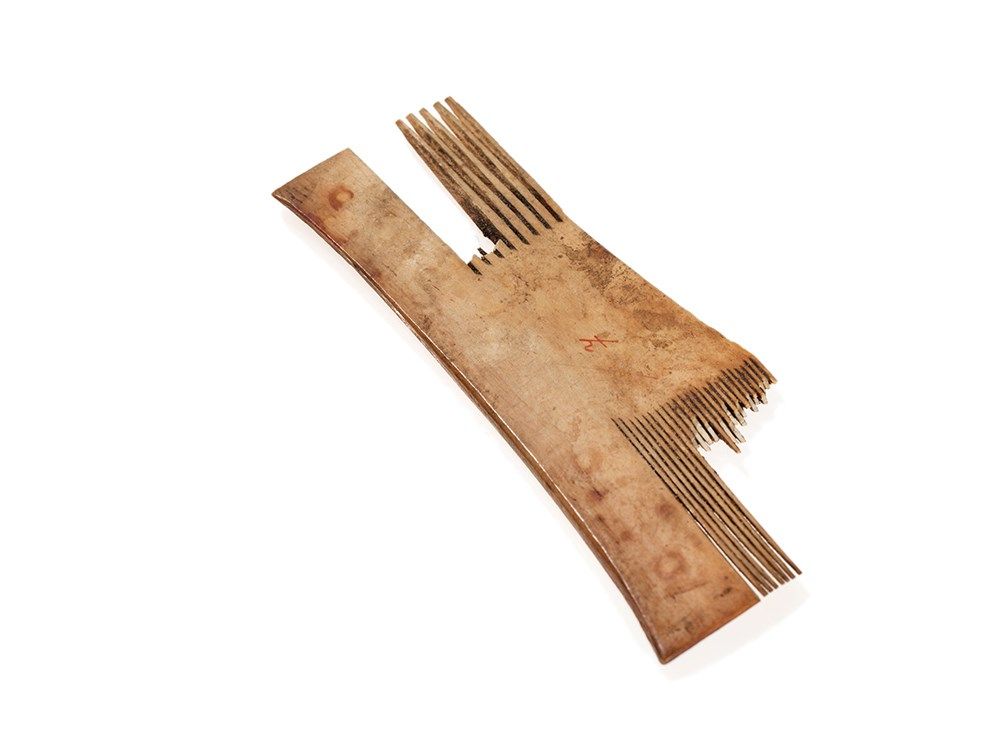 The bronze comb is in a good state of preservation according to its age, some teeth are missing. It measures 6.5 x 7.5 cm. The ivory combs are heavily damaged. They measure 10.5 x 9.5 cm and 11 x 4 cm respectively.