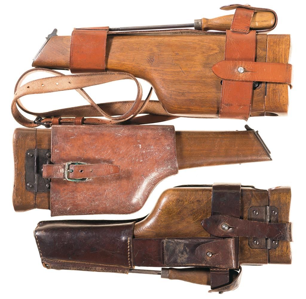 1) Mauser banner marked stock holster with leather harness and cleaning rod. 2) Stock holster with leather harness marked with Chinese script. 3) Stock holster with 1916 dated Hohmann & Sohn leather harness and cleaning rod. Overall very good.