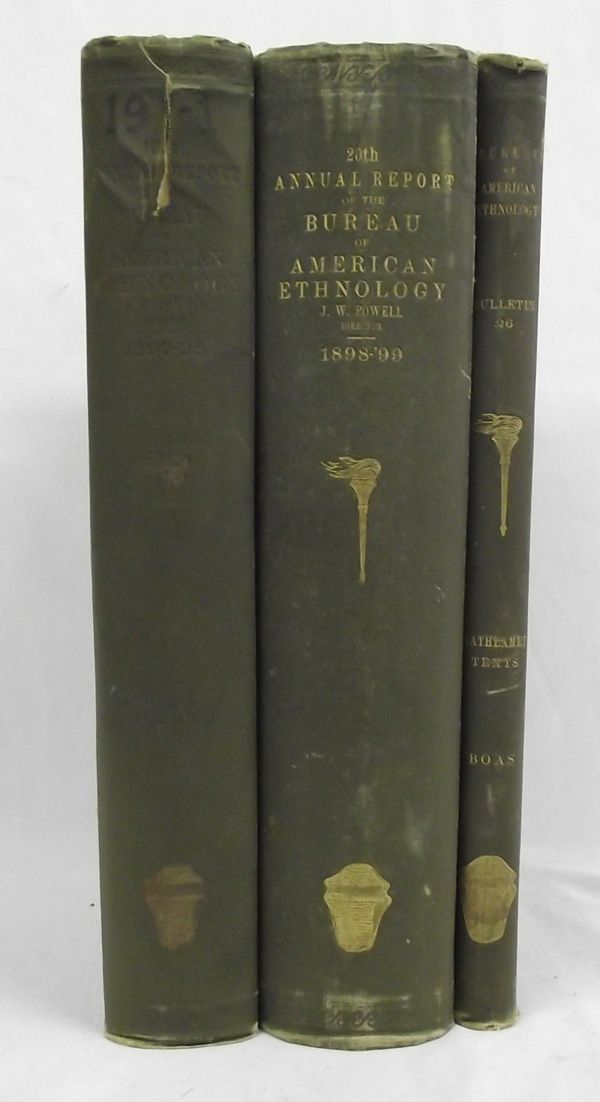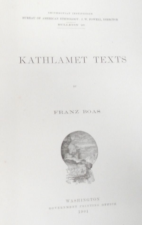 Three Bureau of American Ethnology Hardback Books, 1900, 1901, 1903. Smithsonian of Washington DC Office. Illustrated and full of interesting research and data. The 1901 version KATHLAMET TEXTS by Franz Boas has myths and tales which were recorded and translated. These myths and tales were collected between 1890 and 1894 - a time when the Kathlamet dialect was spoken by only three persons, and originally published by the Smithsonian Institution in 1901. This book contains the texts and their translations into English, followed by a grammar and dictionary of the language, which contains a comparison of all the known dialects of the Chinookan stock. The Kathlamet is that dialect of the Upper Chinook which was spoken farthest down the river.