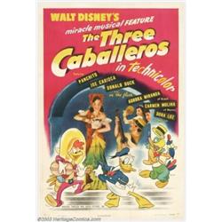 Three Caballeros (RKO, 1944). One Sheet (27" X 41"). Hey! If "Saludos Amigos" was a smash hit, lets give them more! Or so the Disney machine thought when they put "The Three Caballeros" into production. The film was also tailored for the South American market which was one of the few foreign venues still open to US product during World War II. Disney decided it was time to re-visit the interaction of animation with live action for this film; an area he hadn't experimented with since his "Alice" series of cartoons in the early 1920s. The film was a hit and solidified Disney's position of producing episodic features during the remainder of the war years. Fine on Linen. Important notice: Heritage usually auctions material at the rate of 200-250 lots per hour. On some occasions eBay Live bid software or the Internet may not be able to keep up with the pace of the auction. We recommend placing a realistic absentee bid now as insurance to avoid disappointment. Occasionally the auctioneer may eliminate or reject an eBay Live bid, and the auctioneer may also reopen a lot after the close of the eBay live bidding (usually because we missed an audience bid), and may reject your bid even if it shows you as the winning bidder. By bidding via eBay Live, you agree that Heritage may award the lot to another bidder at its sole discretion under the circumstances described above or any other reasonable circumstances. Also please note that all Heritage lots purchased through eBay Live carry a 20% Buyer's Premium. Please make sure you read the Terms and Conditions before you bid.