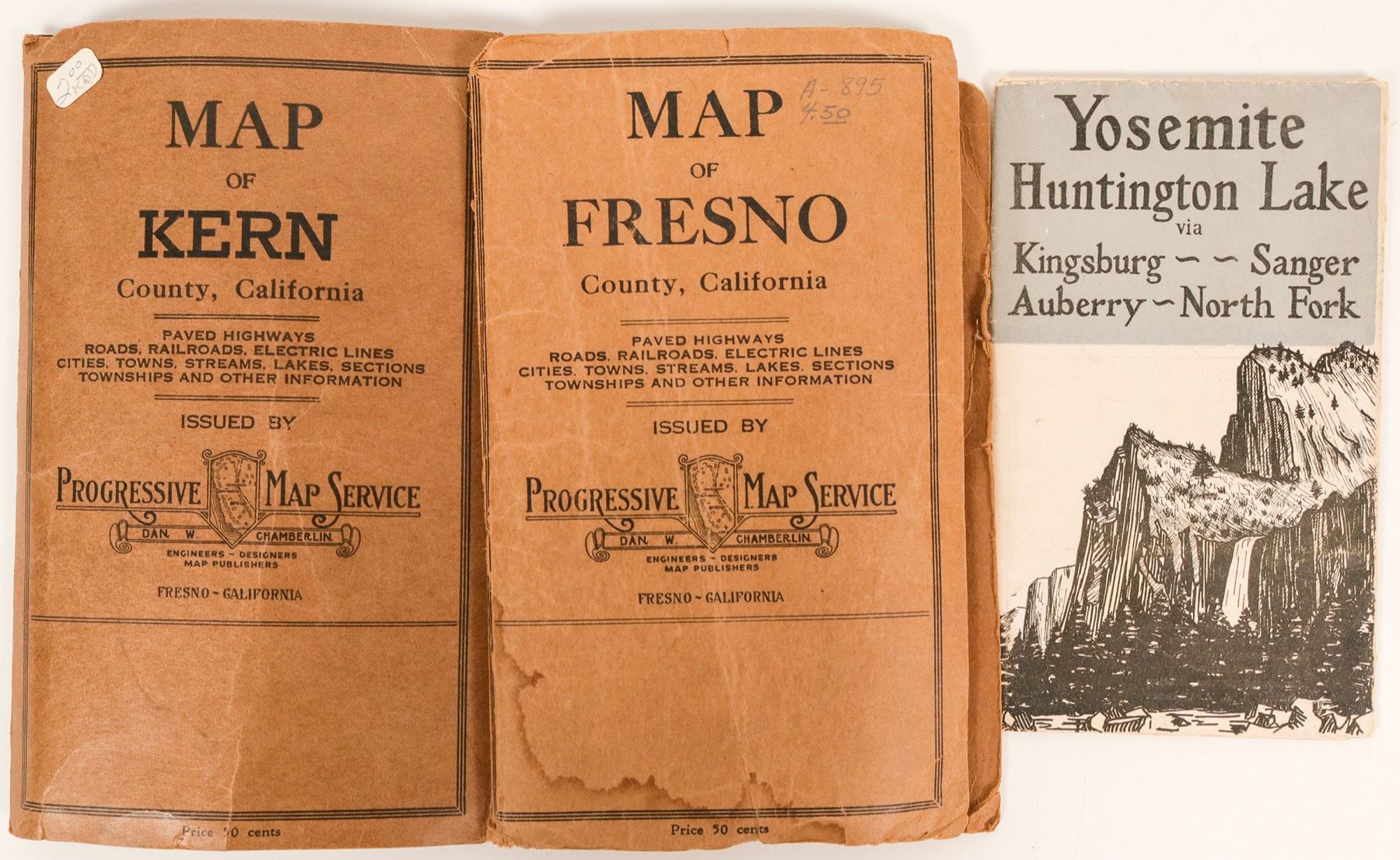 Three early pocket maps. There is one for Kern County, one for Fresno and one that is a little newer that shows all the lodging and recreation sites of Yosemite National Park. All in good condition.