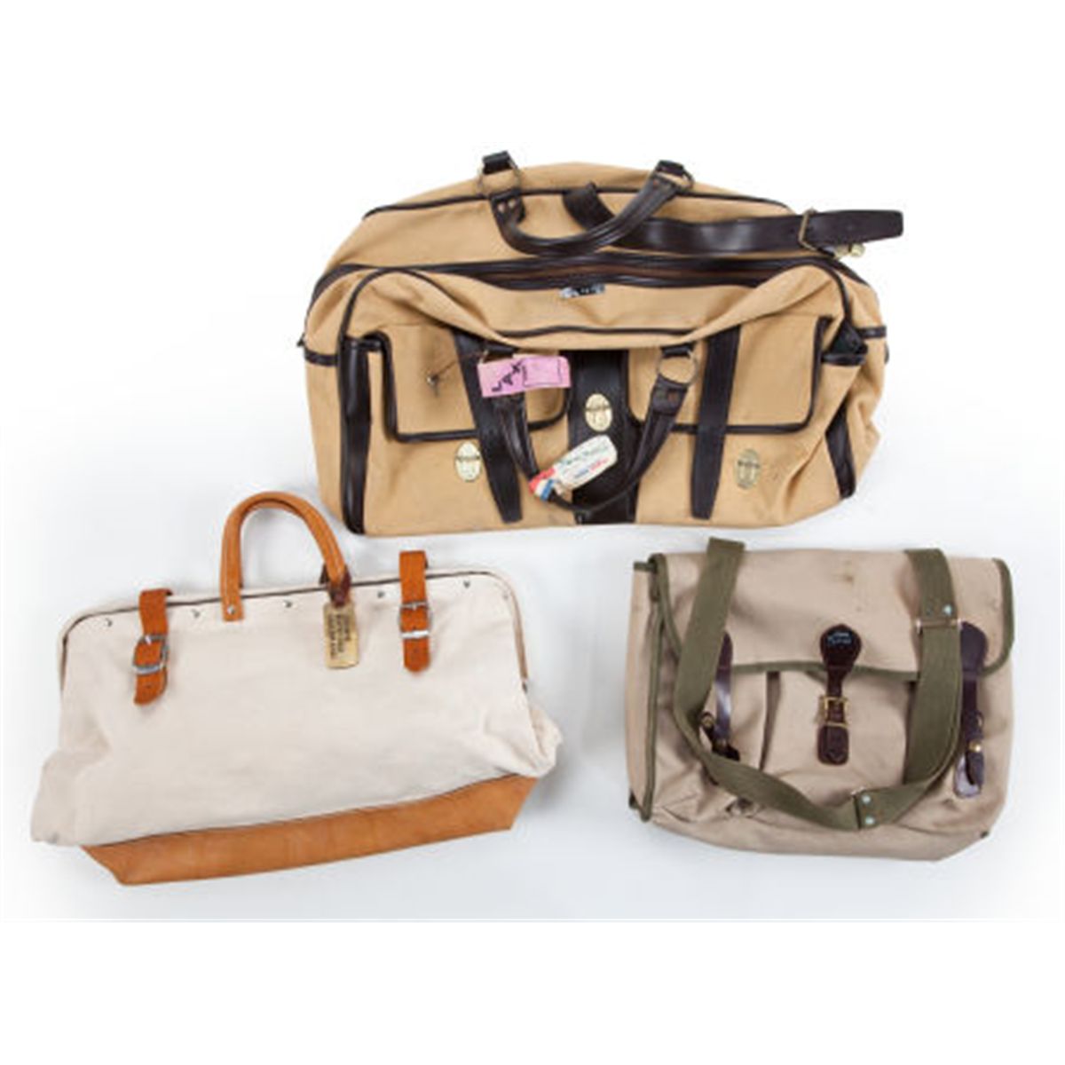 Three Canvas Tote Bags, 1970s. The first off-white with tan leather trim, brass tag affixed to handle reads "John Wayne / Newport Beach, California 92663;" the second khaki-colored with dark brown leather buckle straps, a 'label maker' tag affixed to front reads "John / Wayne," inside contents left there by Wayne include decks of cards, Alka-Seltzer, and a shoe horn, plus a few other items; the third tan with dark brown vinyl detailing, an American Airlines baggage ID tag has a handwritten annotation reading "John Wayne," a 'label maker' tag affixed to front also notes his name, inside contents left there by him include eye drops, a cigarette lighter, a Bible, and autograph cards.11" x 21" x 6" and smaller