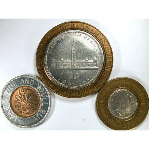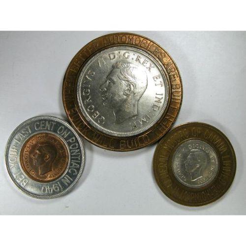 You Can Bet Your Bottom Dollar on Buick in 1940 - HJ Carmichael; a 1939 Silver Dollar mounted in a Brass Ring. Plus Bet Your Last Dime on Buick in 1940; a 1939 Ten Cents piece mounted in a Brass Ring. Plus Bet Your Last Cent on Pontiac in 1940; a 1940 Cent mounted in a Brass Ring. A total of three pieces, the rings are uncirculated, the coins are not