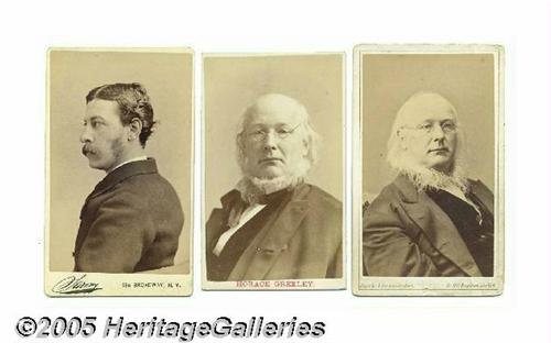 <B>Three Cartes de Visite: Two of Horace Greeley and One of James Gordon Bennett</B></I> Two CDVs of Horace Greeley, 1811-1872. A journalist, reformer, and the Liberal Republican and Democratic candidate for President in 1872. Prior to Bill Clinton moving into town, it was Greeley who was known as the "Sage of Chappaqua." One carte by Sarony, the other by Bogardus. A fine pair. Together with a Sarony carte of felllow New York publisher James Gordon Bennett. Three items together. Lot:259