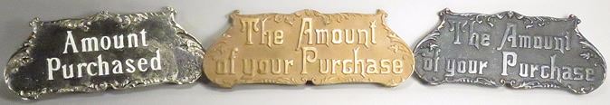 Three Cash Register Top Signs. Amount Purchased, nickel, 8 inches. The Amount of your Purchase, copper flash, 8 inches. The Amount of your Purchase, brass, 9 inches.