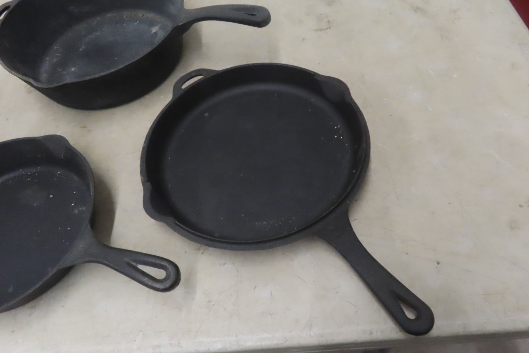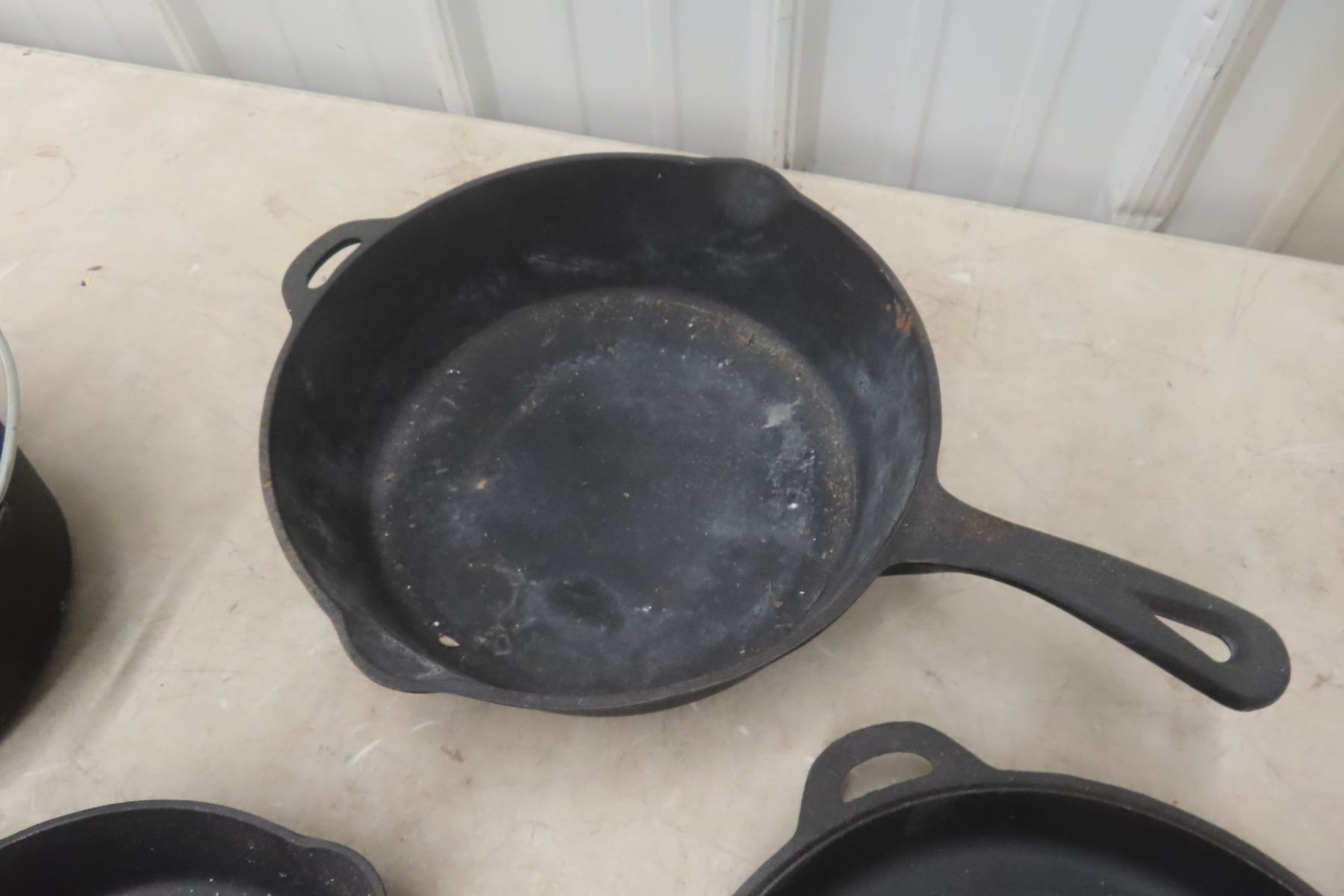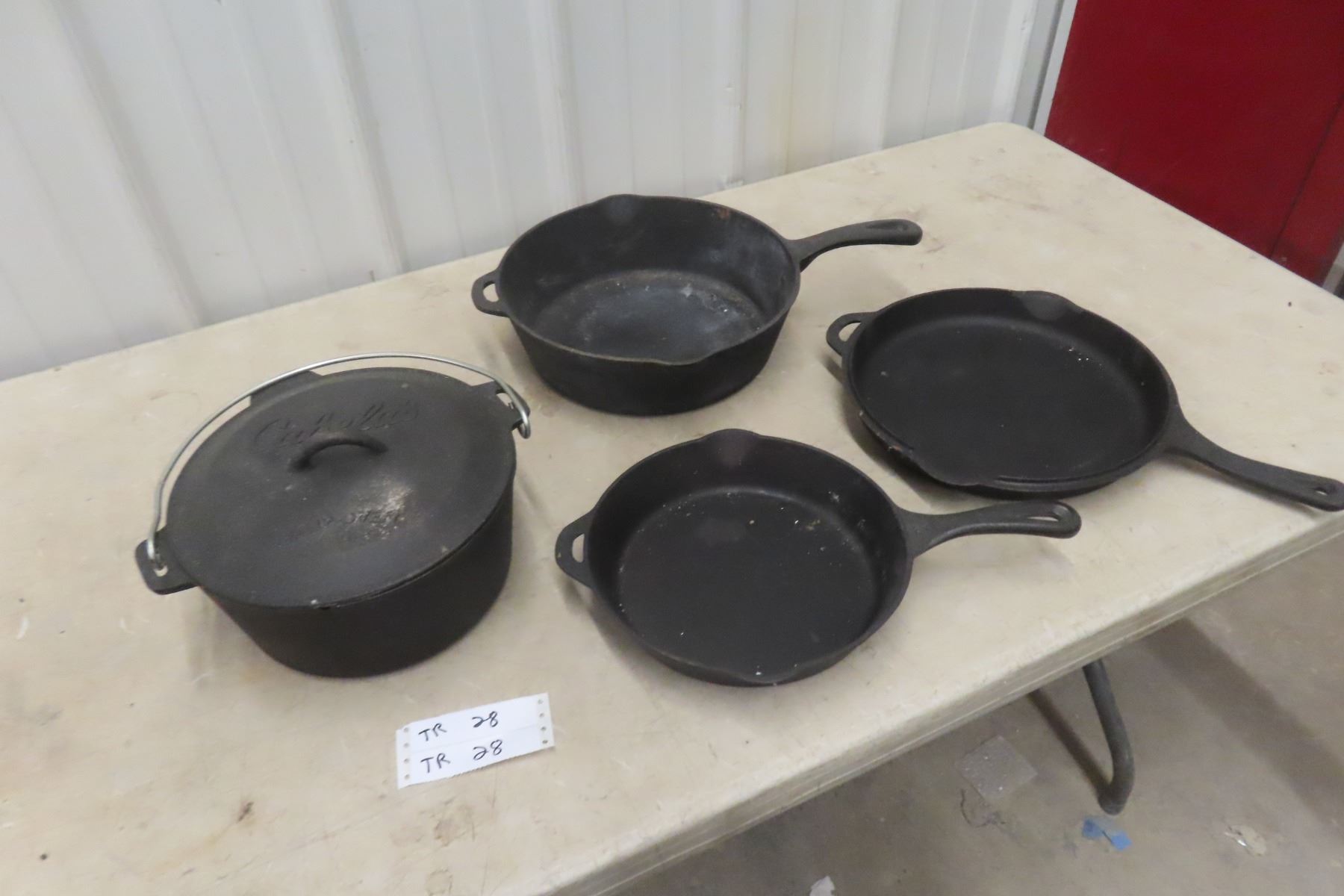 Three Cast-Iron Frying Pans and Cast-Iron Dutch Oven