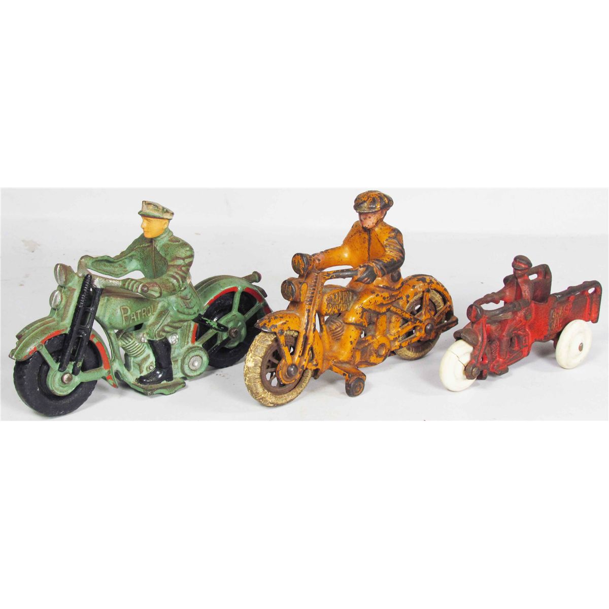 Three Cast Iron Toy Motorcycles. Orange Harley Davidson, Arcade Green Patrol and Red Crash Car. Good overall original condition. Patrol measures 6 1/2 inches long.