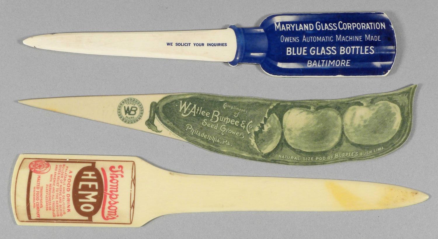 Lot of Three Celluloid Advertising Letter Openers including Thompson's "Hemo" Food Drink. Maryland Glass Corporation, mfg of Blue Glass Bottles, Baltimore and W. Atlee Burpee & Co. Seed Growers Philadelphia, Pa. All in near mint condition. Start Price $40