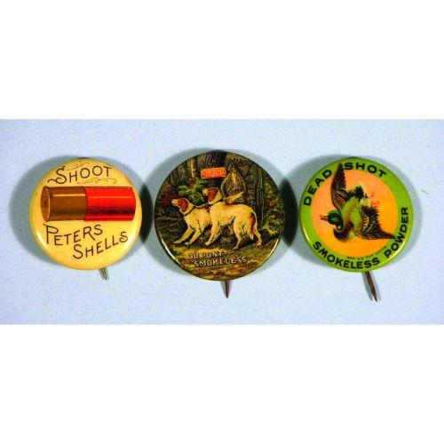 Three Celluloid Pinbacks including Peters Shells, Dupont Smokeless Powder and Dead Shot Smokeless Powder. Excellent condition. Approx. 1 inch diameter.
