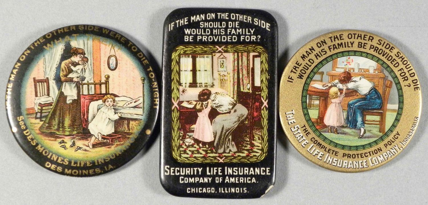 Lot of 3 Celluloid Pocket Mirrors. Advertising Life Insurance from Des Moines Life, Security Life Chicago and State Life Indianapolis. All in excellent condition. Round mirrors measure 2 1/8 inch diameter. Starting bid $40