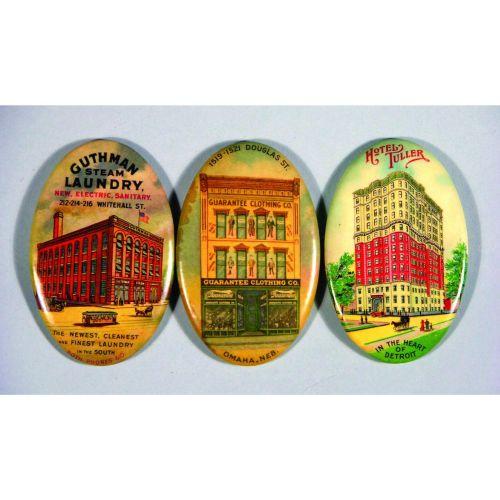 Three Celluloid Pocket Mirrors including Guthman Steam Laundry, Guarantee Clothing Company, Omaha, NB and Hotel Tuller Detroit, MI. Excellent condition. 2 3/4 X 1 3/4 inches.